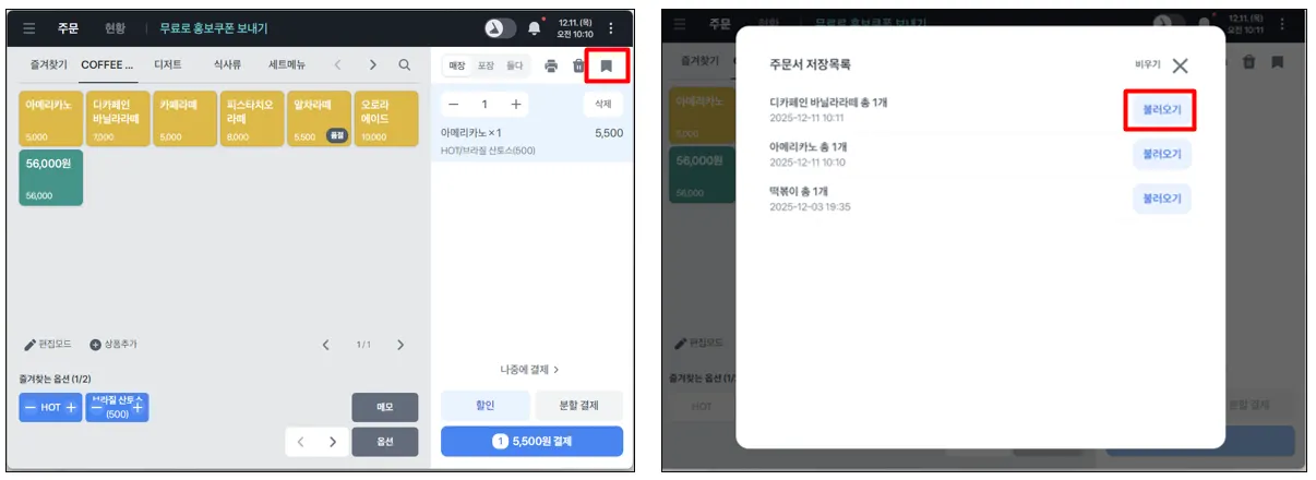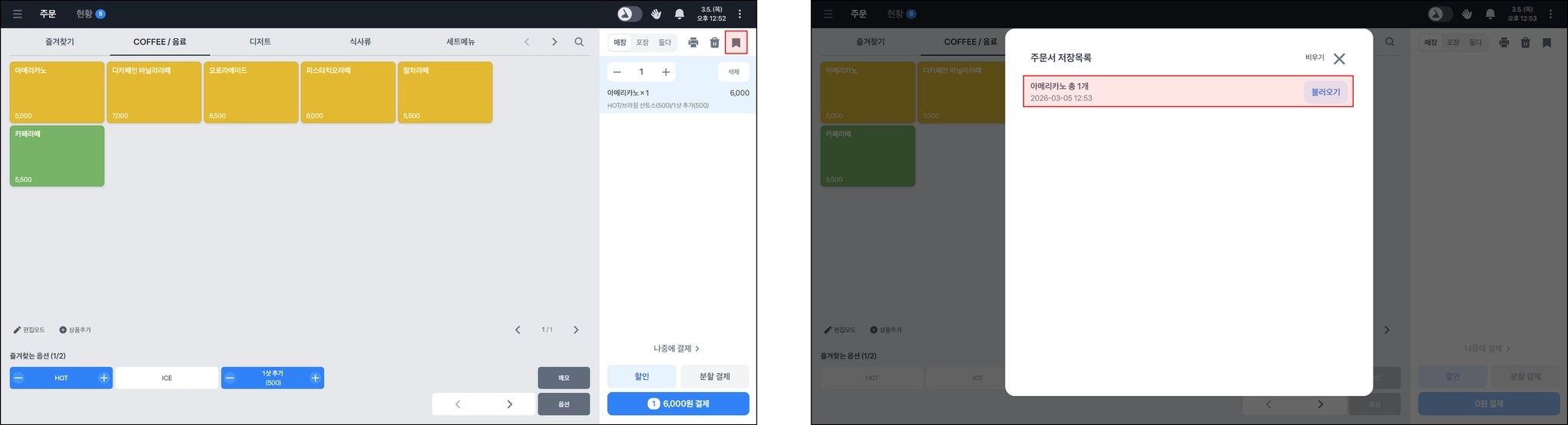 상단 북마크 버튼을 누르면 주문한 내역을 임시저장 할 수 있어요.