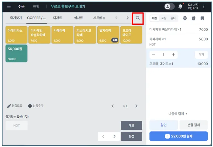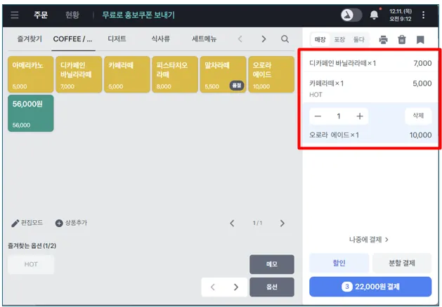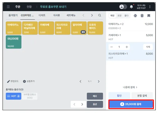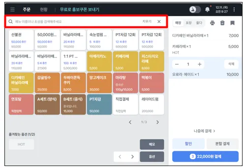 주문 메뉴를 클릭하면, 오른쪽 주문내역에 해당 메뉴들이 표시돼요.