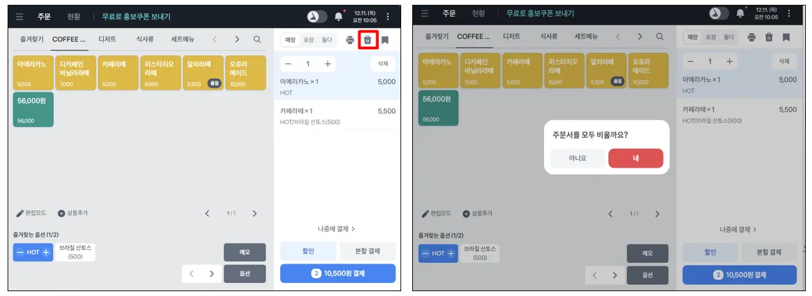 휴지통 버튼을 누르면 주문한 내역을 모두 삭제 할 수 있어요.
