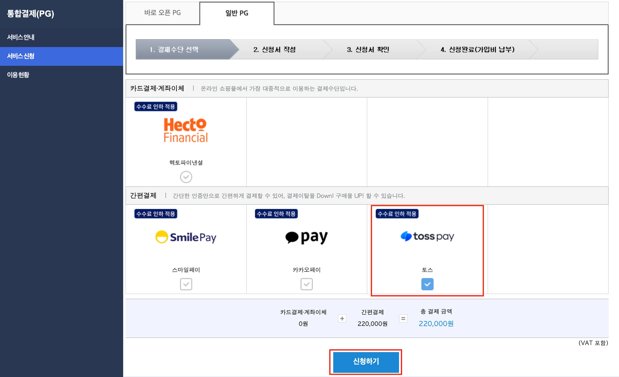 경로 : 서비스 신청 → 일반 PG → 간편결제 → 토스 선택