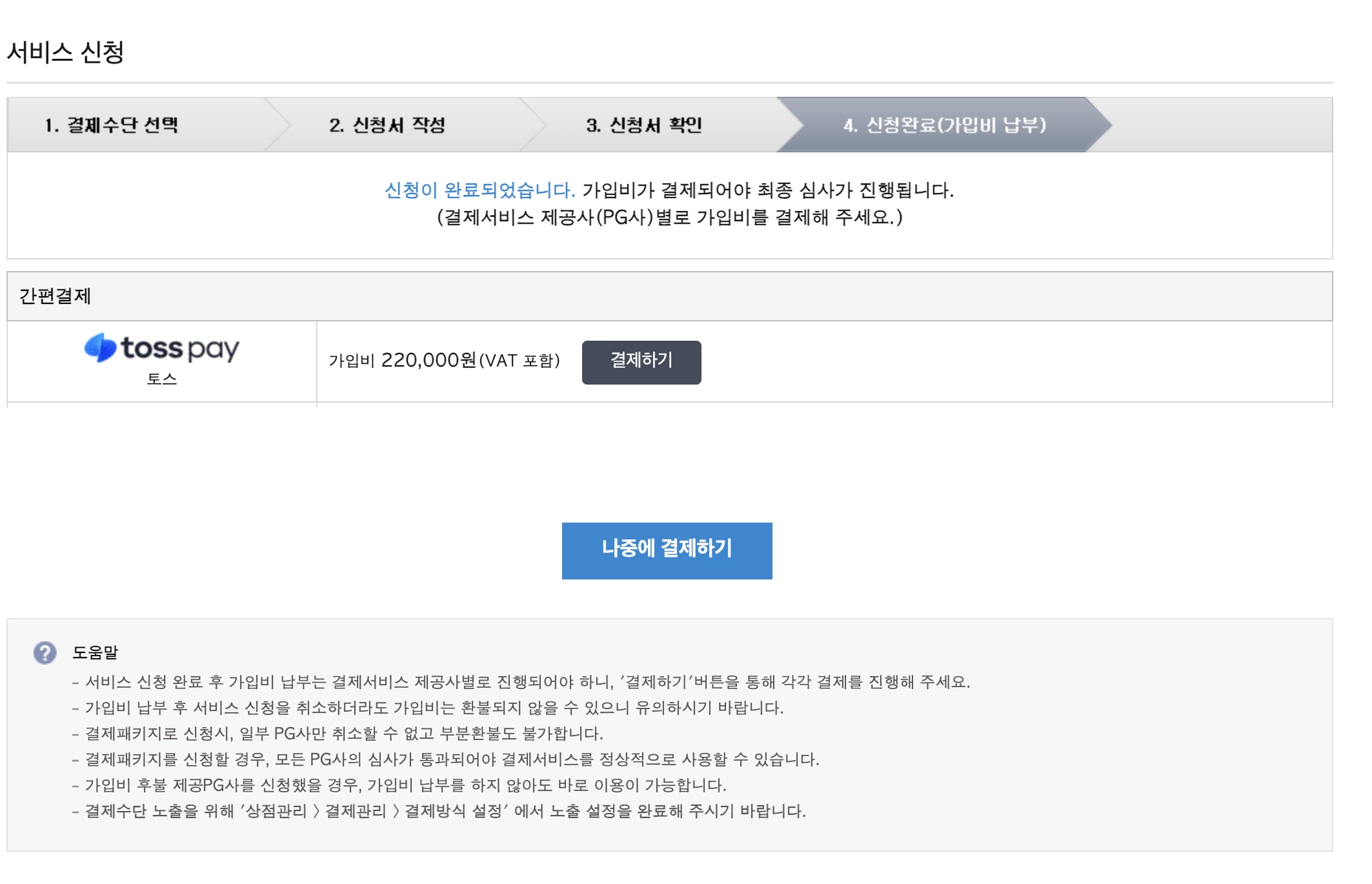 가입비 결제를 진행하지 않고, [나중에 결제하기]를 눌러 신청을 종료해주세요