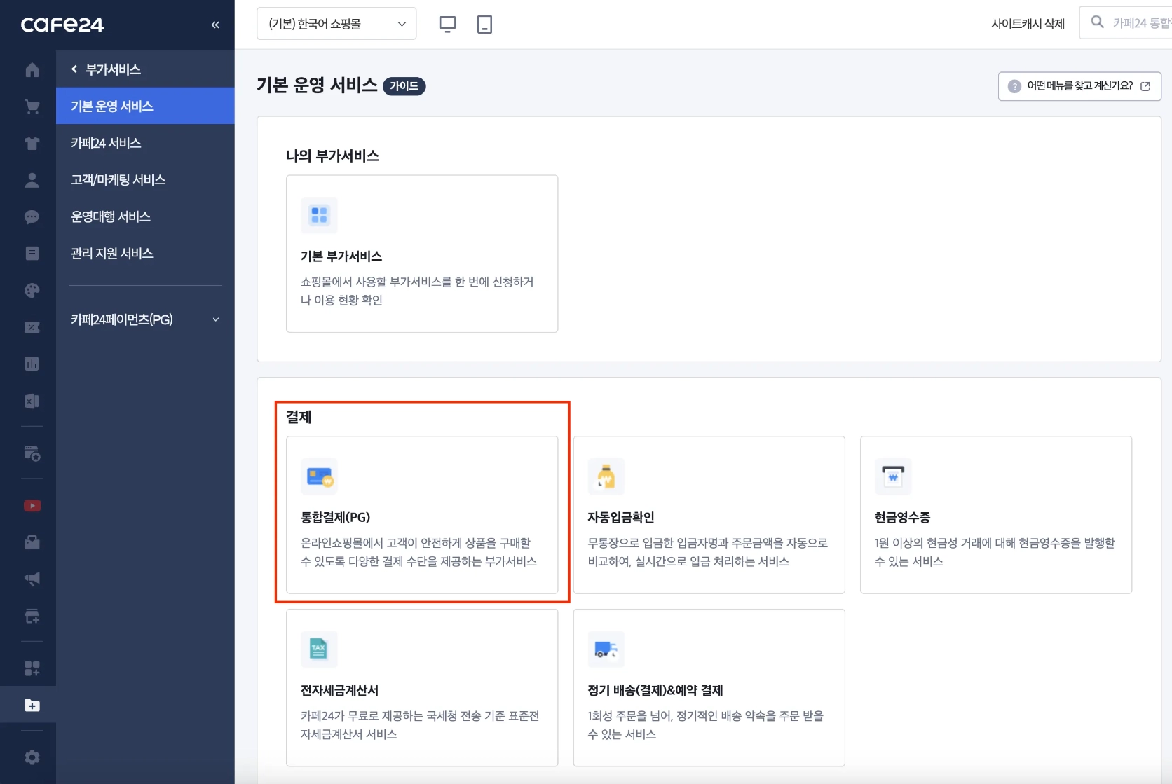 ๊ฒฝ๋ก : ์นดํ24 ๋ก๊ทธ์ธ โ ๋ถ๊ฐ์๋น์ค โ ๊ธฐ๋ณธ ์ด์ ์๋น์ค โ ํตํฉ๊ฒฐ์ (PG)