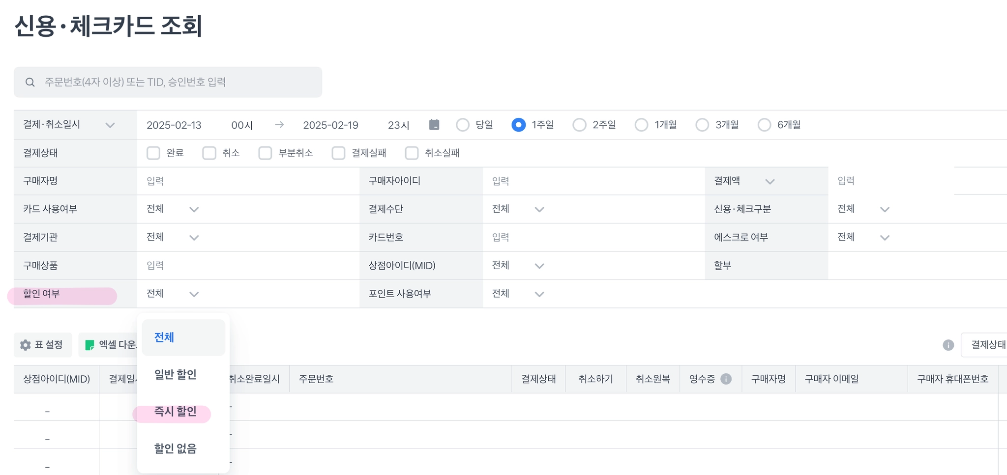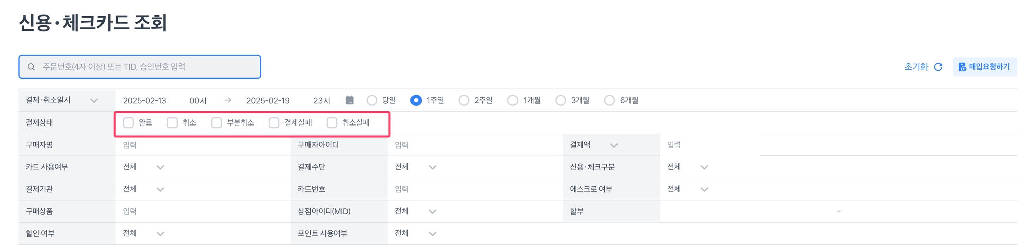 결제상태를 “취소”로 체크하고 조회하면 내역 확인이 가능해요