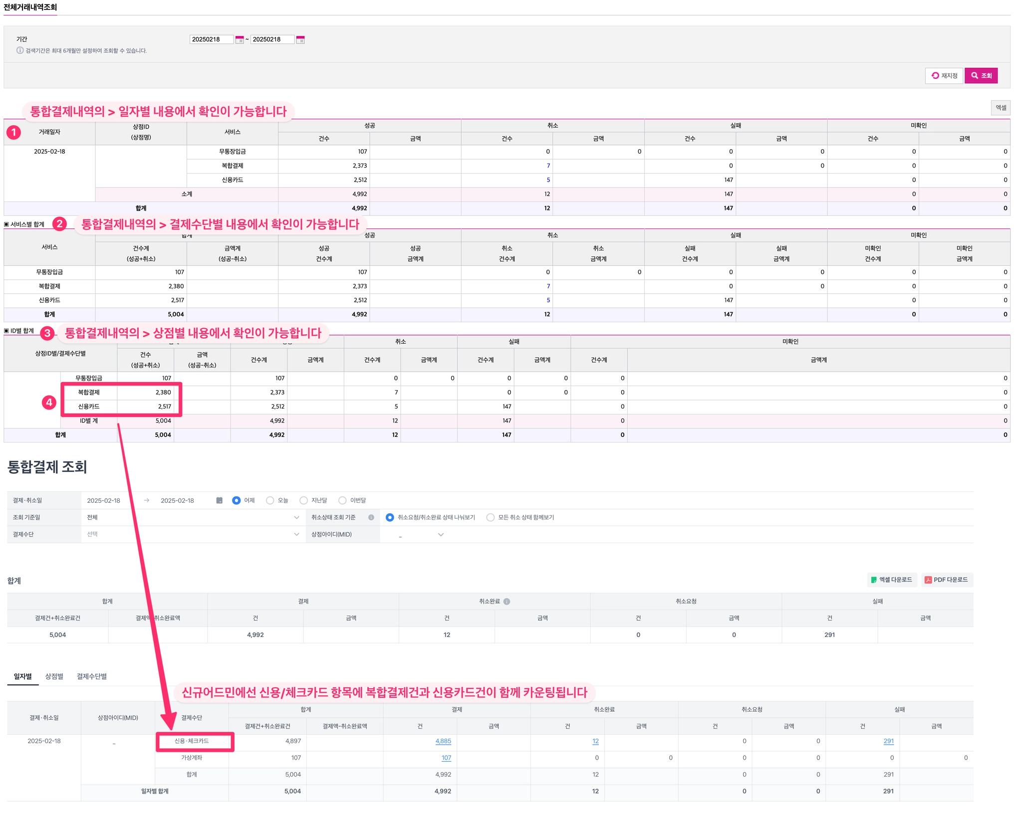 신규 관리자에서는 신용・체크카드 항목에 복합결제건과 신용카드건이 함께 카운팅돼요