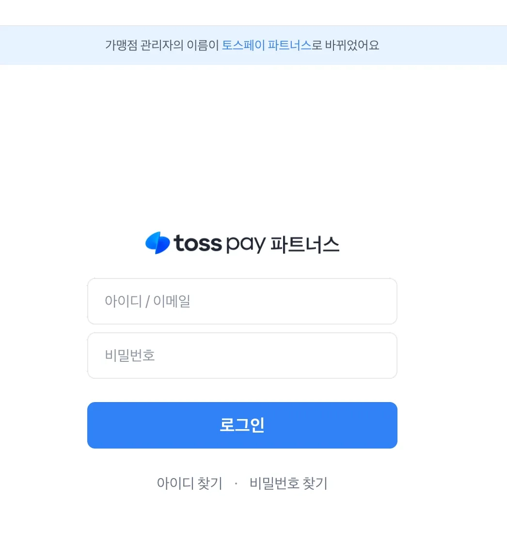최초로 발급된 ID(MID와 동일)와 임시 비밀번호로 토스페이 파트너스 로그인을 진행해주세요.  토스페이 파트너스 바로가기: https://tosspay.toss.im/partners/auth/login
