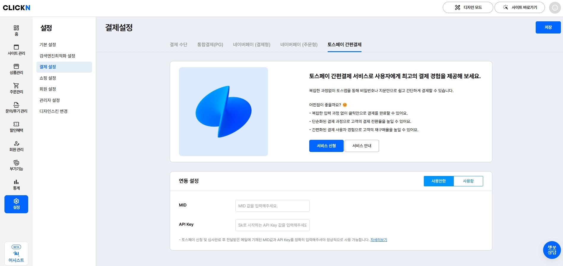 경로 : 클릭엔 → [결제설정] → 토스페이 간편결제 → MID & API KEY 입력 → 저장