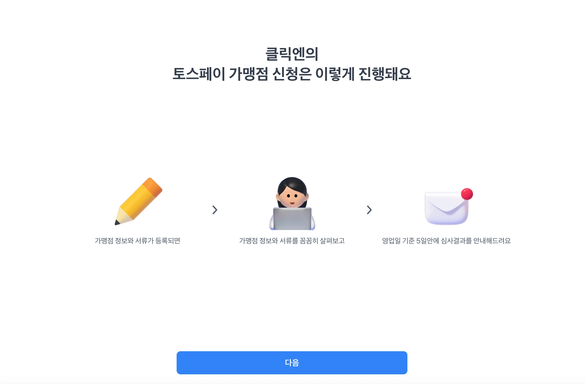 ํ† ์ŠคํŽ˜์ด ๊ฐ€๋งน์  ์‹ ์ฒญ ๊ณผ์ •์„ ํ™•์ธํ•ด ์ฃผ์„ธ์š”.