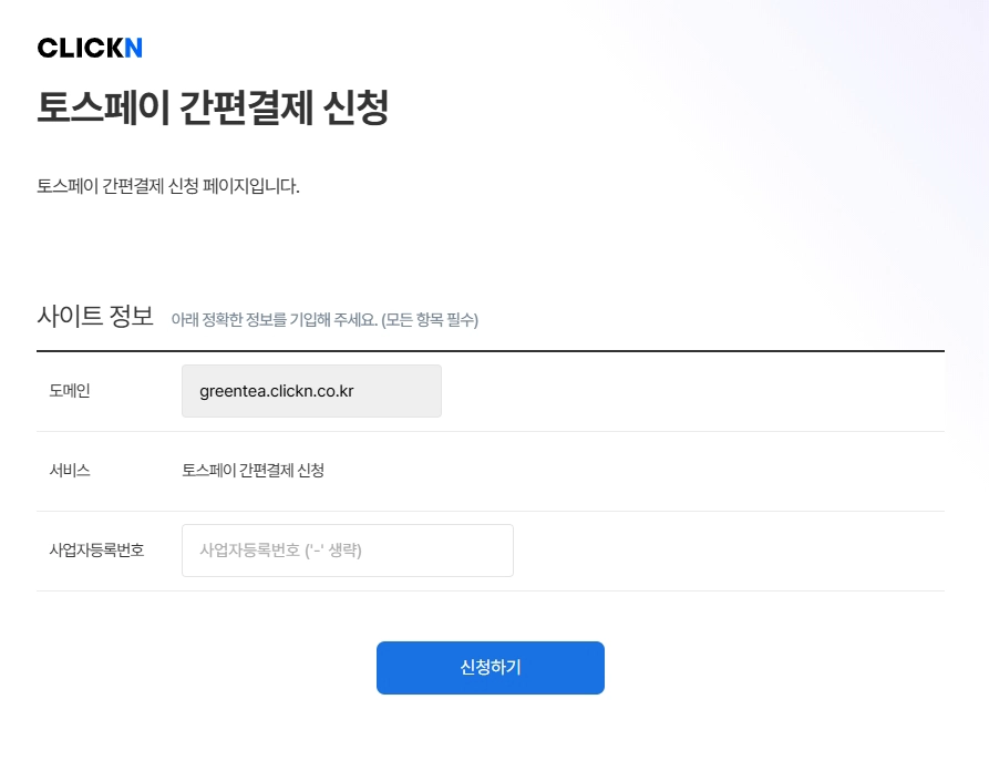 ๊ฒฝ๋กœ : ํด๋ฆญ์—” ๋กœ๊ทธ์ธ โ†’ MYํด๋ฆญ์—” โ†’ ์—ฐ๋™ ํฌ๋งํ•˜๋Š” ๋„๋ฉ”์ธ ์šฐ์ธก [๋”๋ณด๊ธฐ] ํด๋ฆญ โ†’ ๋ถ€๊ฐ€์„œ๋น„์Šค ไธญ [ํ† ์ŠคํŽ˜์ด ์‹ ์ฒญ] ํด๋ฆญ โ†’ ์‚ฌ์—…์ž๋“ฑ๋ก ๋ฒˆํ˜ธ ์ž…๋ ฅ โ†’ ์ „์ž๊ณ„์•ฝ ์ ‘์ˆ˜