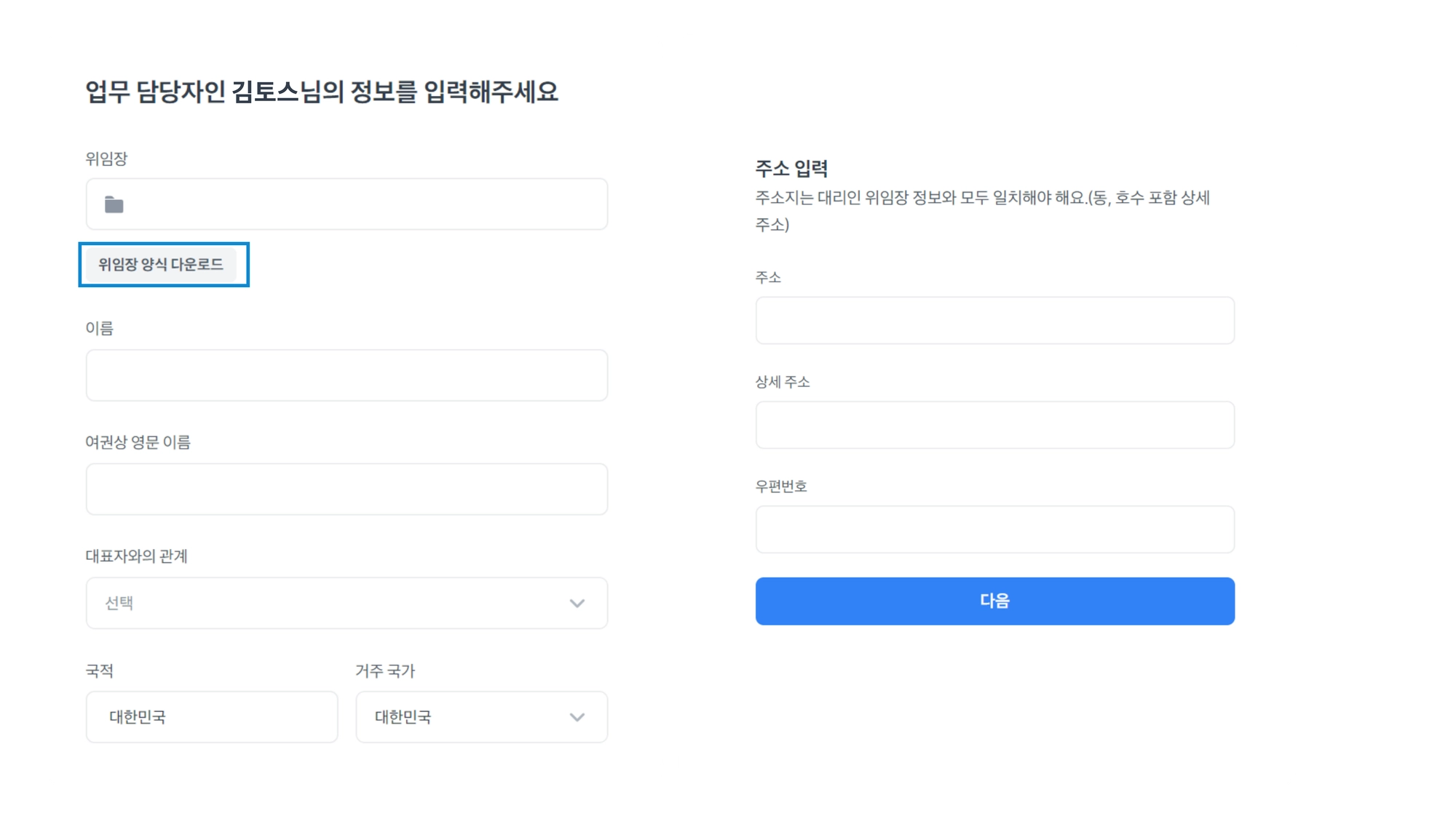 ์—…๋ฌด ๋‹ด๋‹น์ž๋ฅผ ์„ ํƒํ–ˆ๋‹ค๋ฉด, ์—…๋ฌด ๋‹ด๋‹น์ž์˜ ์ •๋ณด๋ฅผ ์ž…๋ ฅํ•ด ์ฃผ์„ธ์š”.