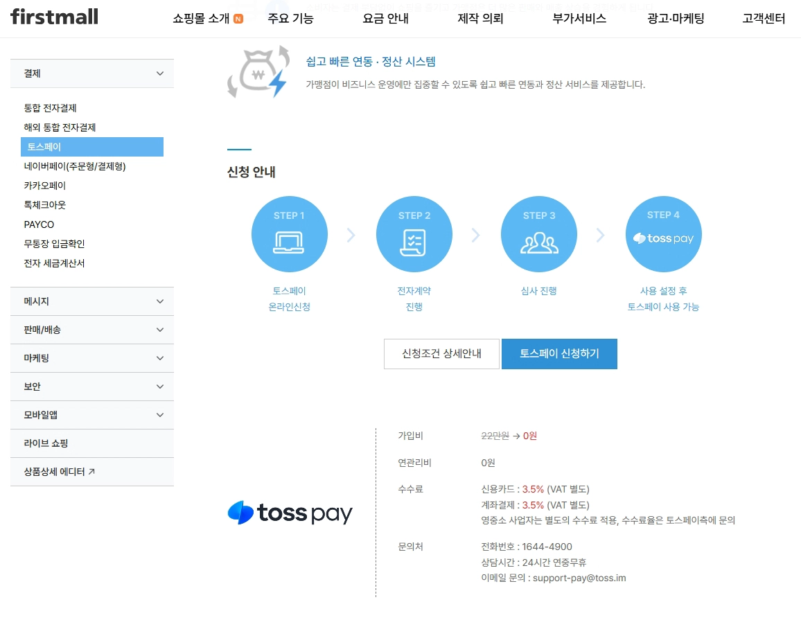 ① 퍼스트몰 홈페이지 내 [토스페이 신청하기] 를 눌러 접수해 주세요.