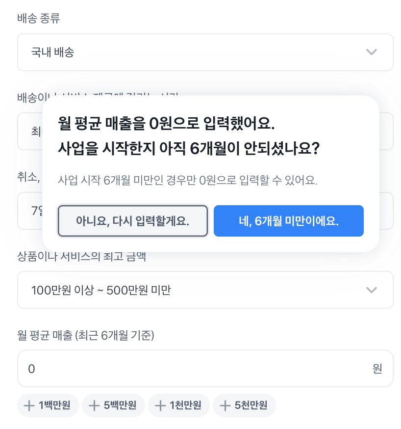 사업 시작 6개월 미만인 경우만 월 평균 매출을 0원으로 입력할 수 있어요.