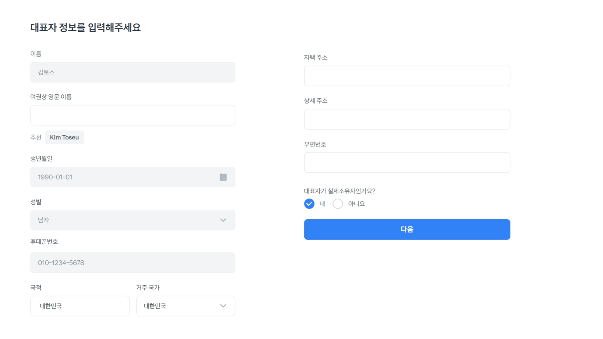 대표자 정보를 입력해 주세요.