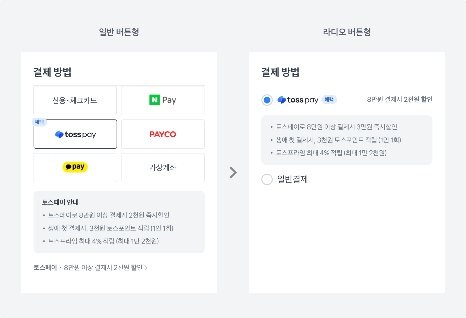 토스페이 프로모션 목표 달성을 위해 일반 버튼형 과 라디오 버튼형로 2주간 테스트 진행.