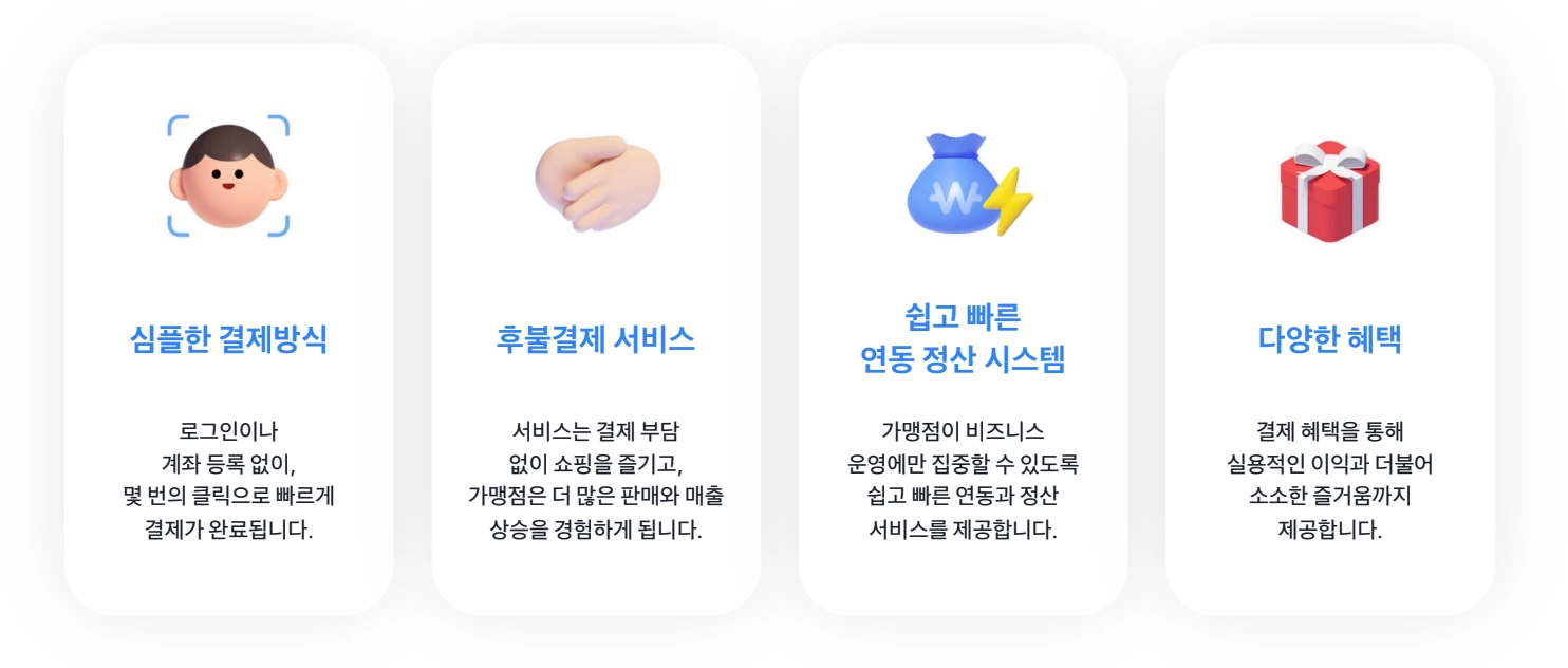 결제 편의성을 고려한 최소한의 단계로 구성되어 있어 손쉽고 빠른 결제가 가능하며, 이는 가맹점의 높은 결제 전환율로 이어집니다.
