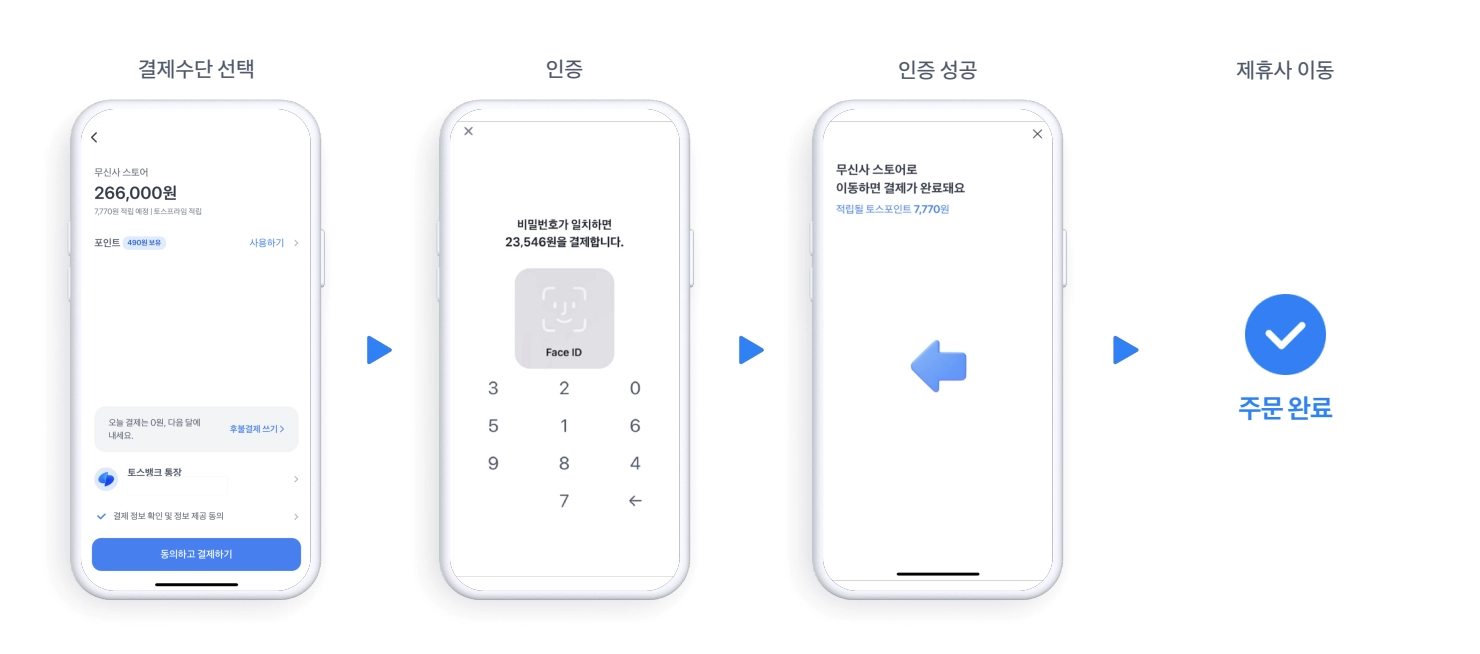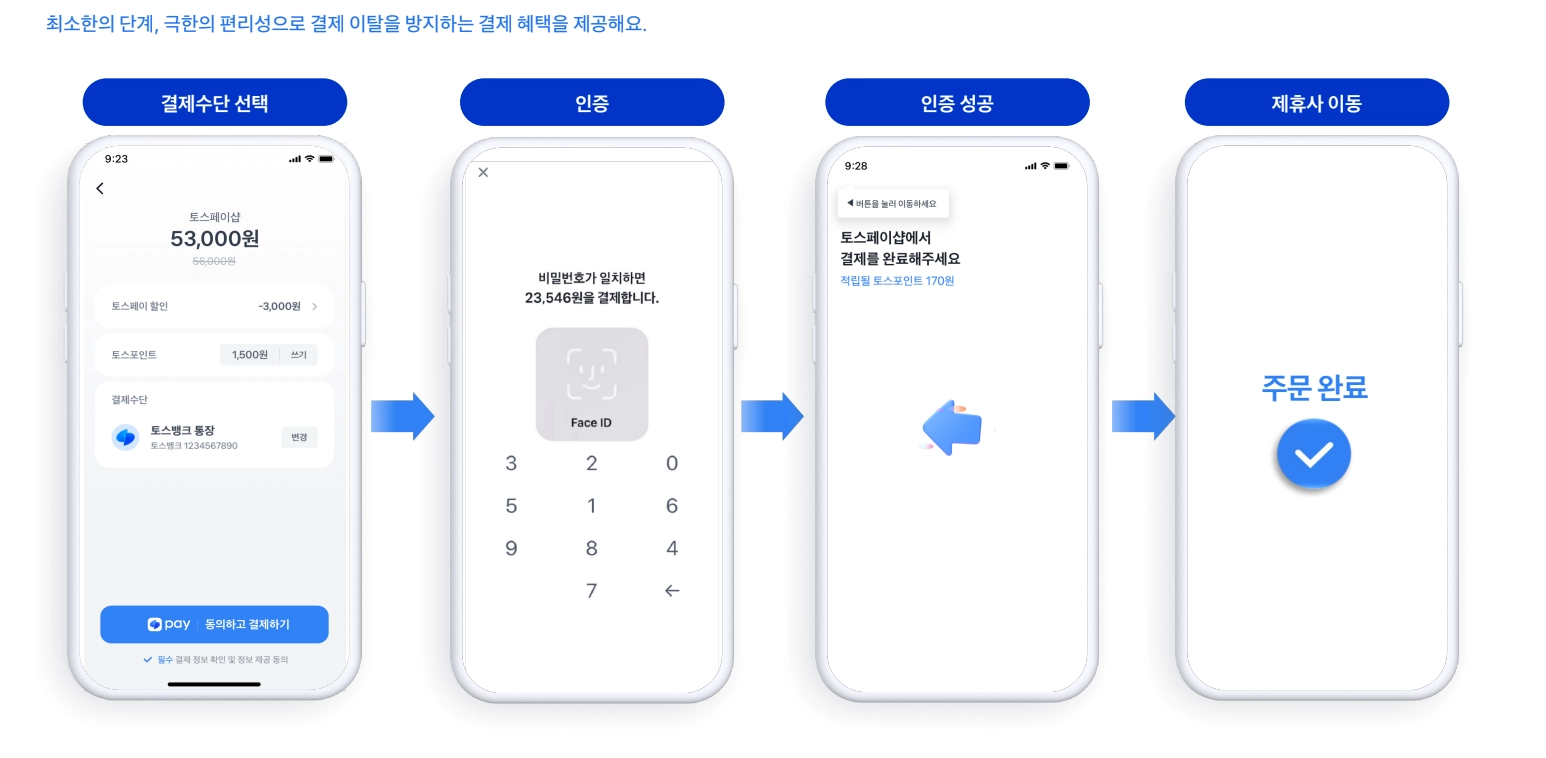 토스페이는 생체 인증, 비밀번호 등 간편한 방식으로 빠르게 결제할 수 있는 서비스입니다.