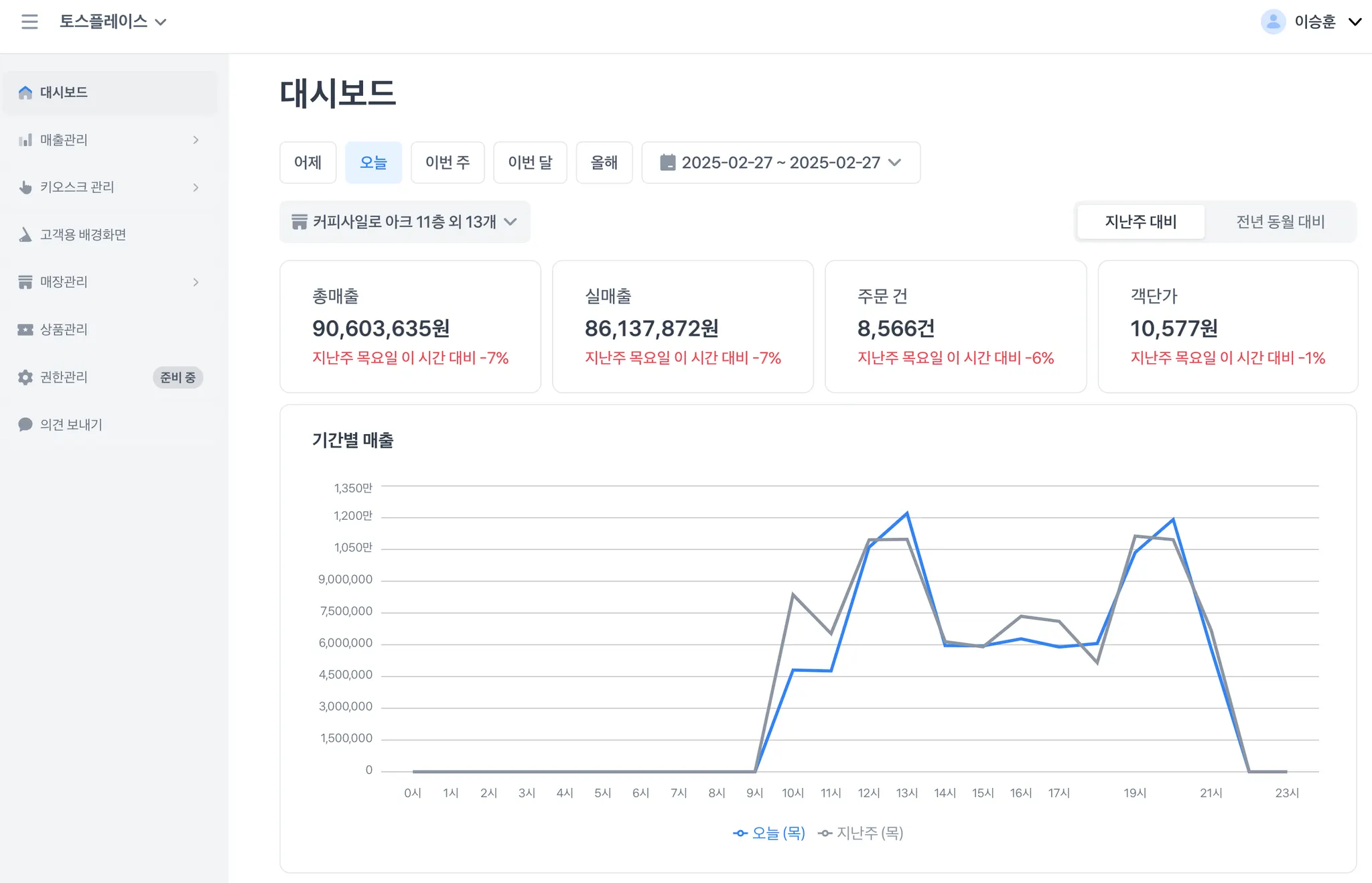 가맹점에 포스가 설치되고, 매출이 발생하면 대시보드에서 매출을 확인할 수 있어요