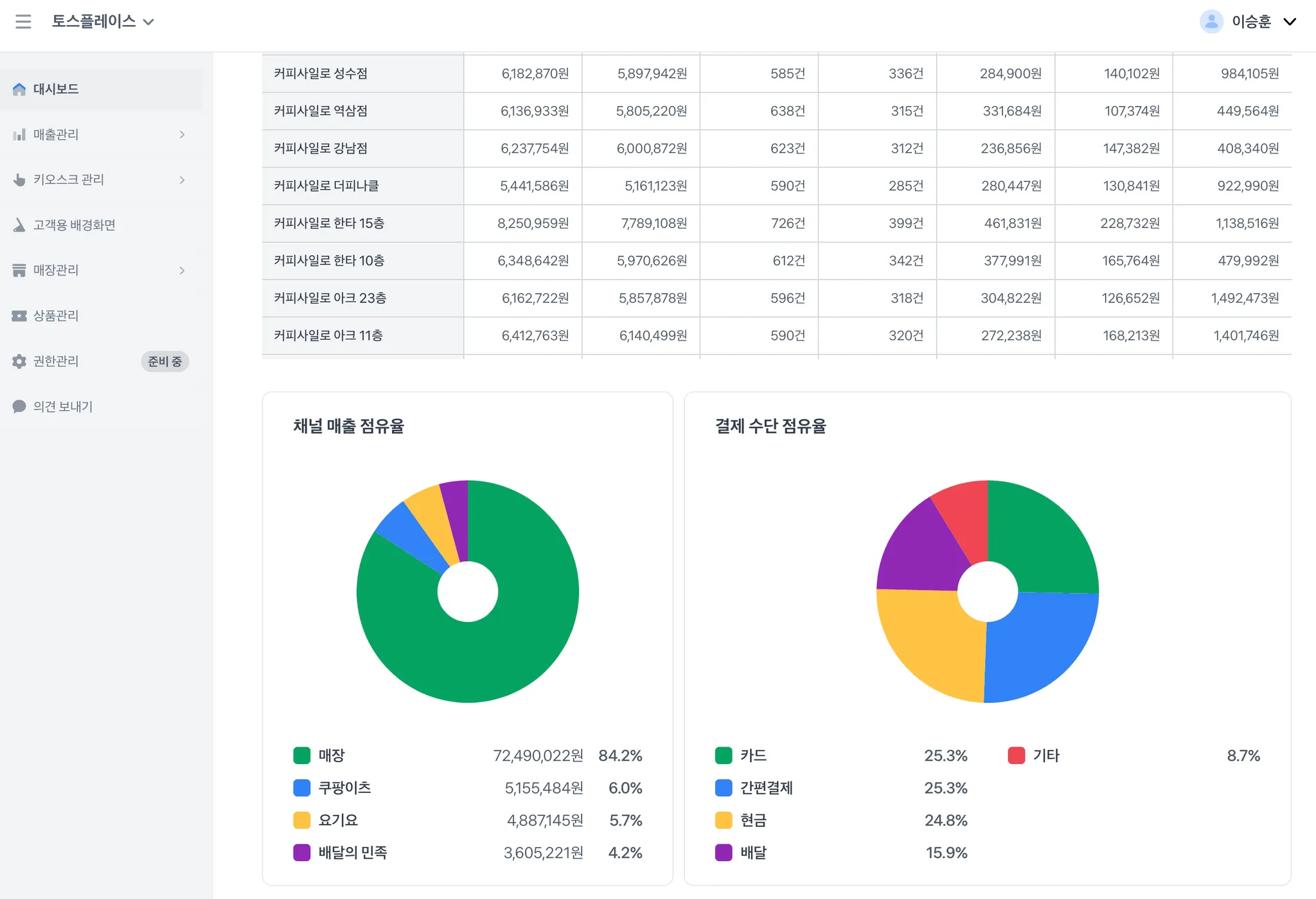 대시보드에서는 추가된 가맹점의 매출/상품을 일괄 관리할 수 있어요.