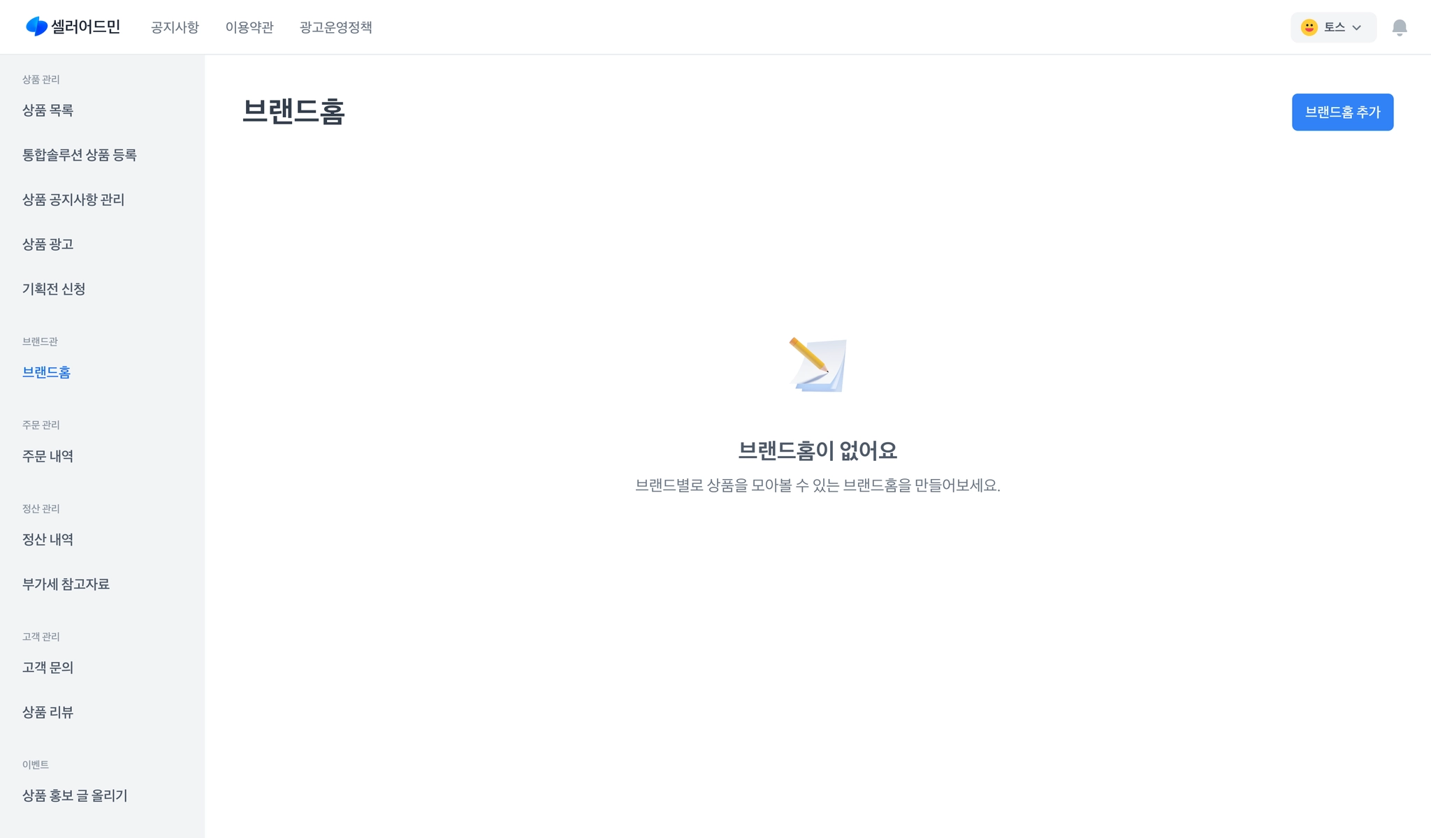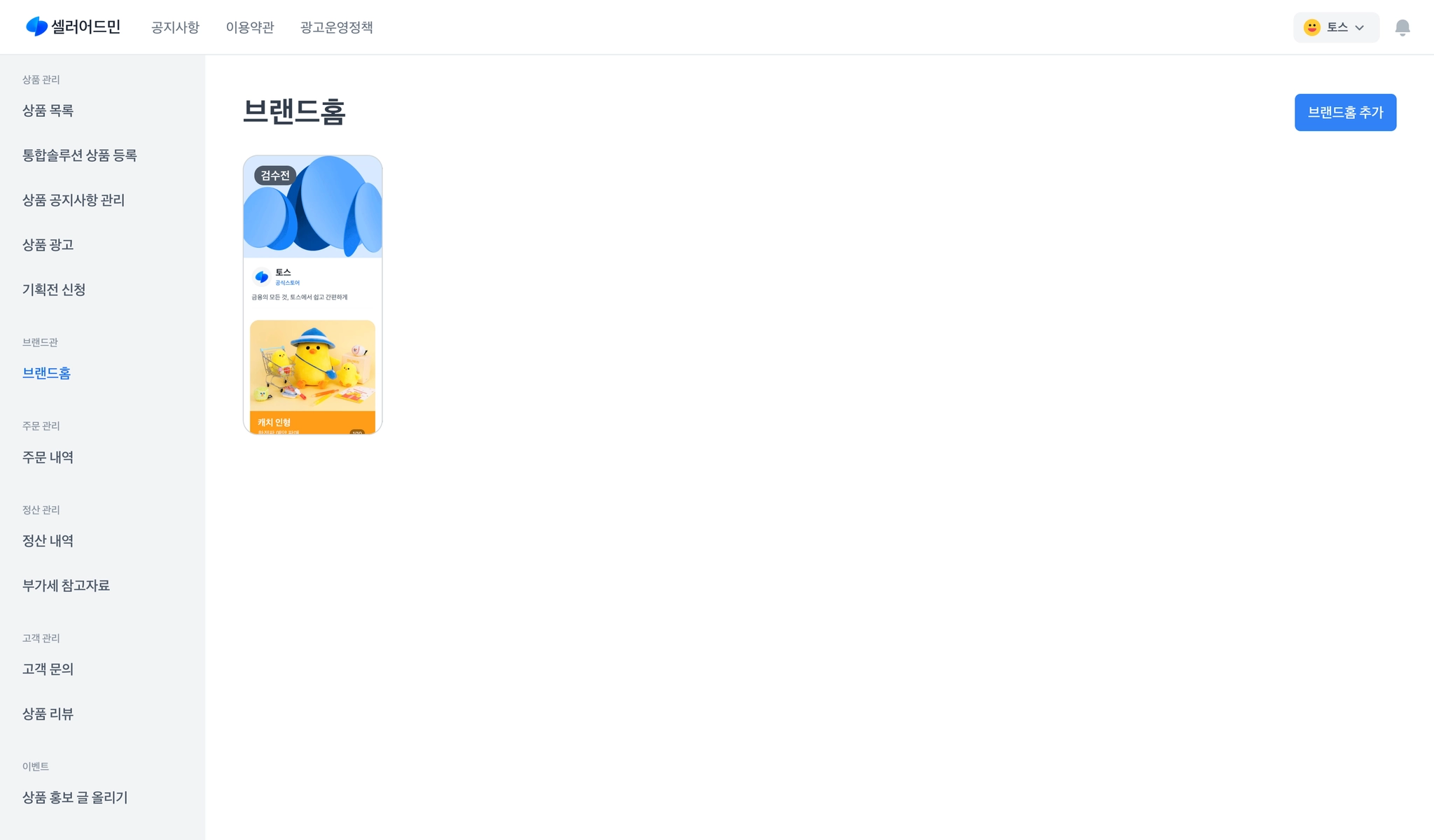토스쇼핑 파트너스 좌측의 [브랜드홈] 탭에서 우측의 [브랜드홈 추가]를 클릭해주세요.