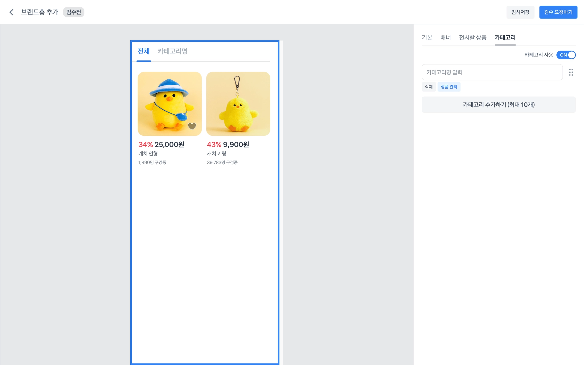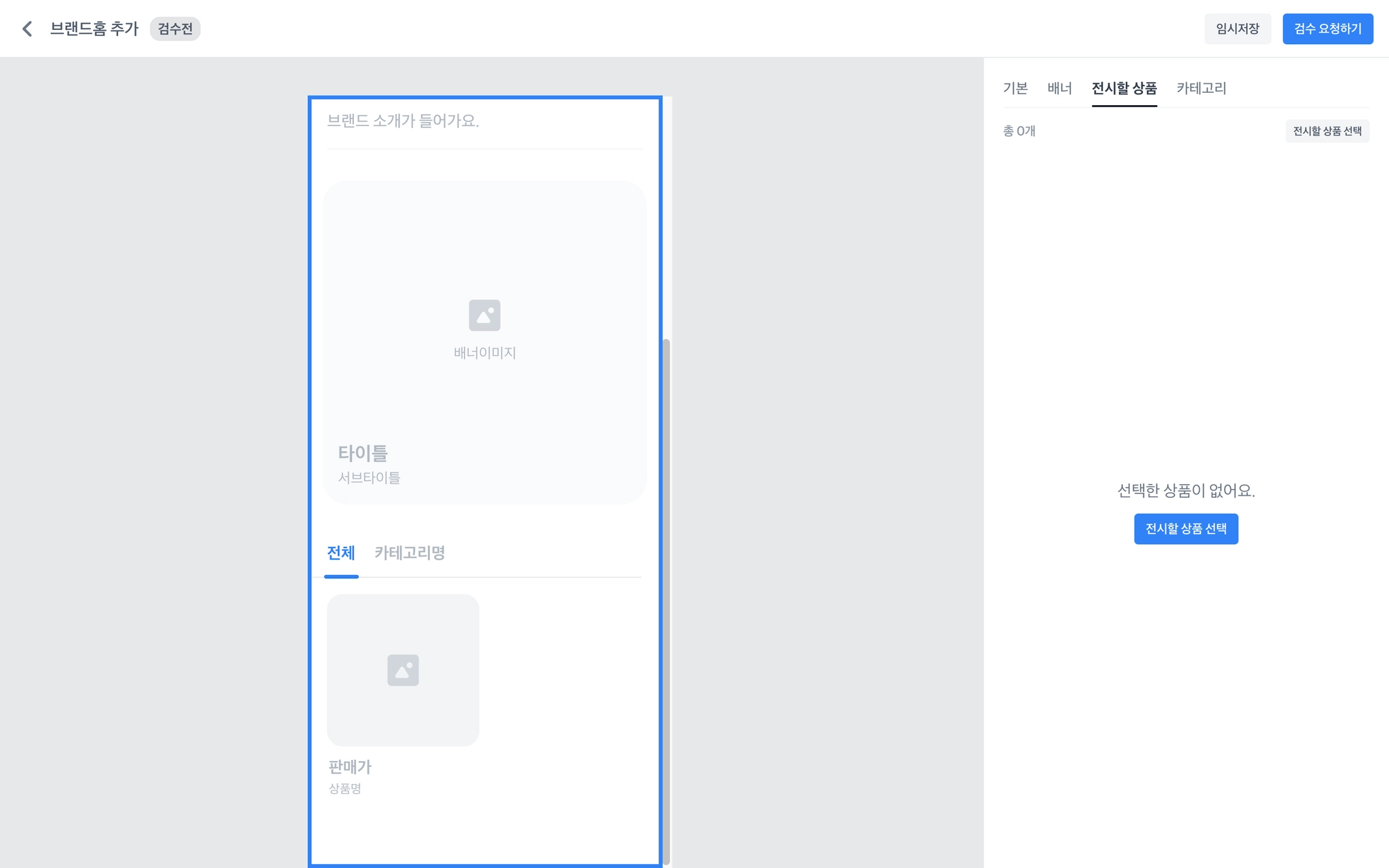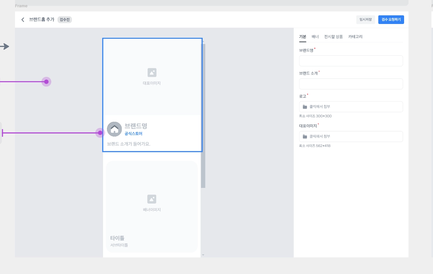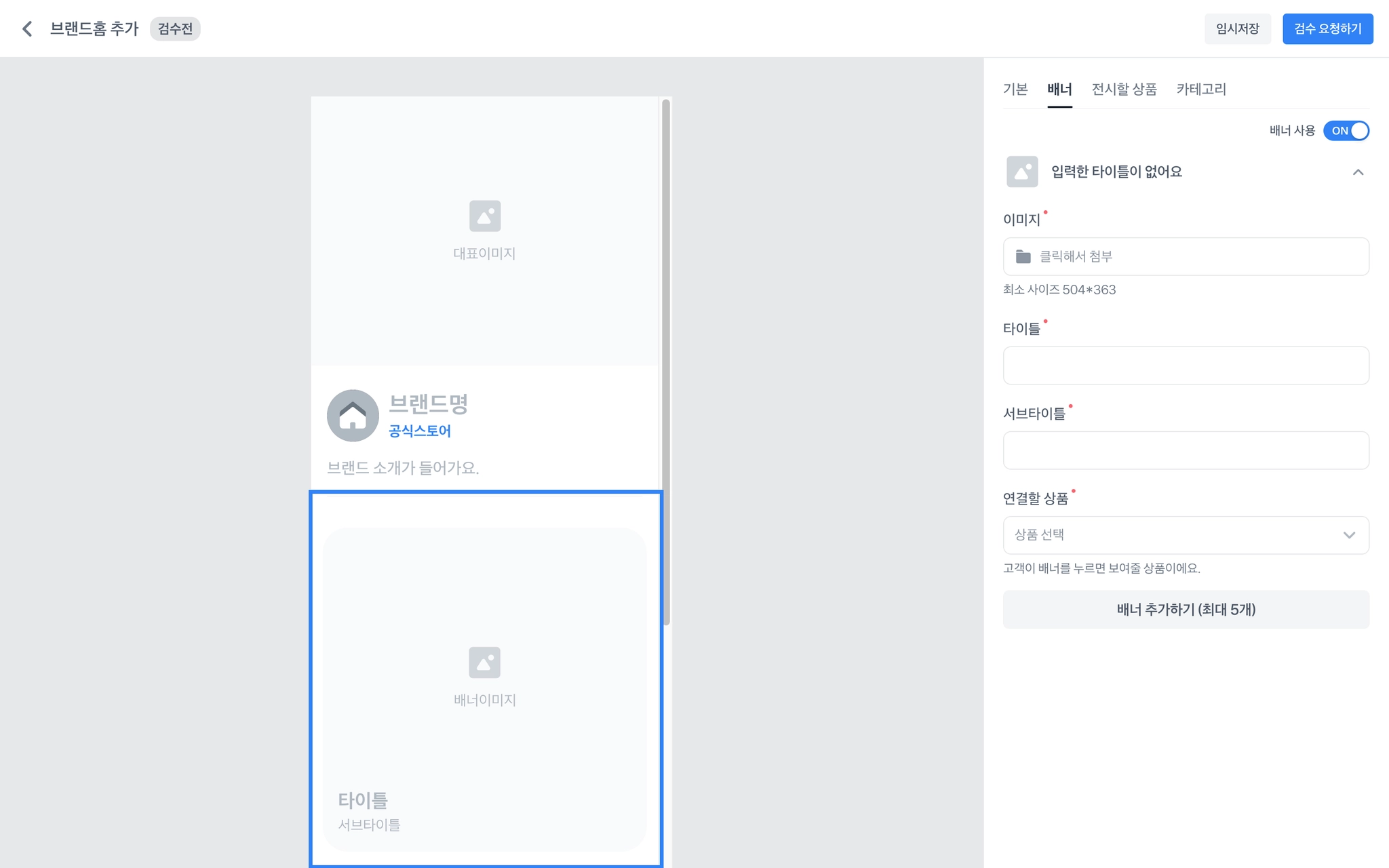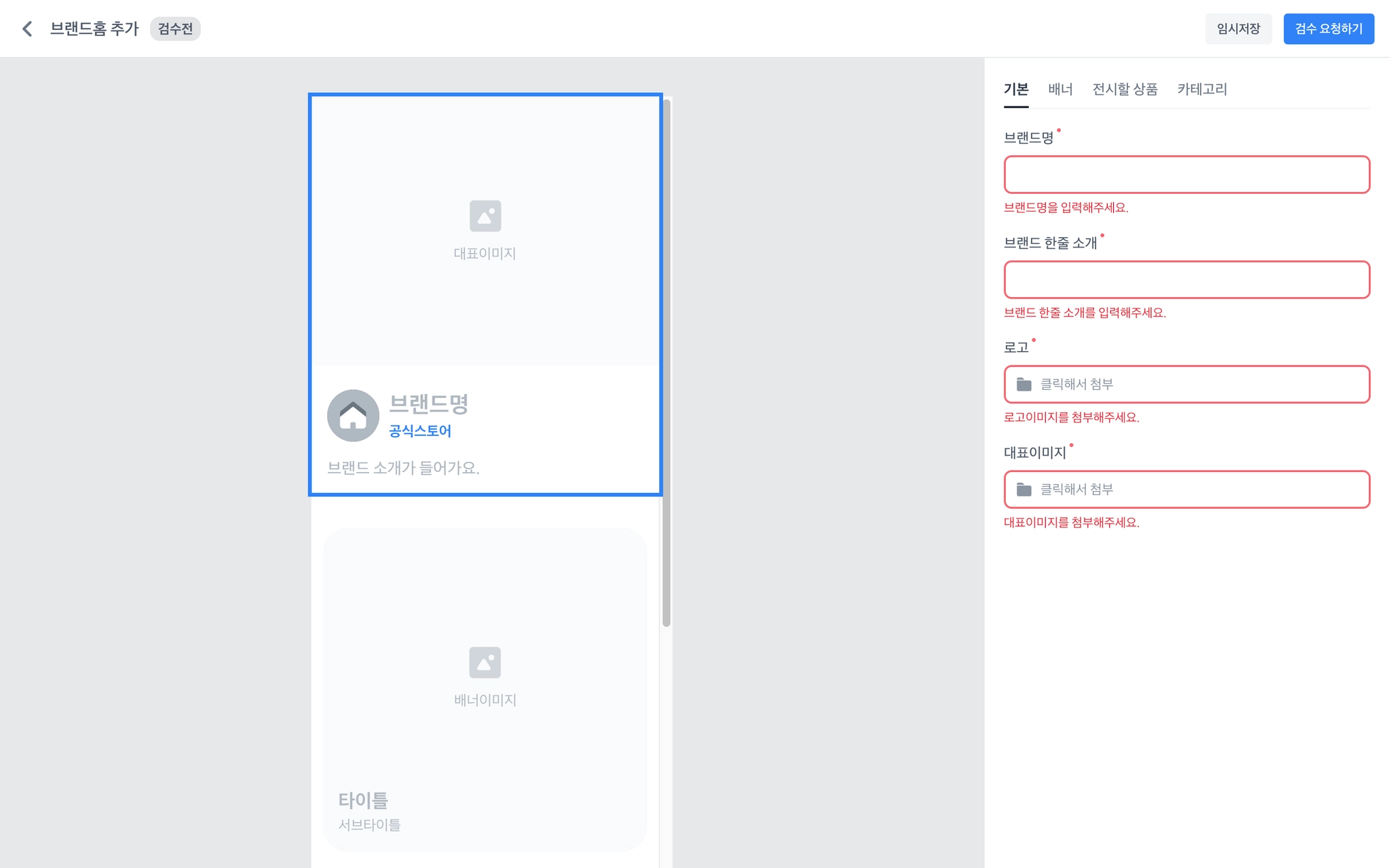 필수 값을 모두 채운 후에 우측 상단의 [검수 요청하기] 를 통해 브랜드홈 검수를 신청해주세요.
