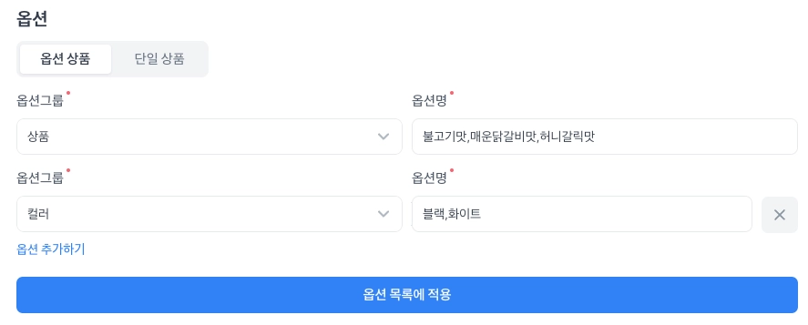 "options": [ { "name": "상품", "order": 0, "values": [ { "name": "불고기맛", "order": 0 }, { "name": "매운닭갈비맛", "order": 1 }, { "name": "허니갈릭맛", "order": 2 } ] }, { "name": "컬러", "order": 1, "values": [ { "name": "블랙", "order": 0 }, { "name": "화이트", "order": 1 } ] }, { "name": "용량", "order": 1, "values": [ { "name": "작음", "order": 0 }, { "name": "중간", "order": 1 }, { "name": "", "order": 2 } ] } ]