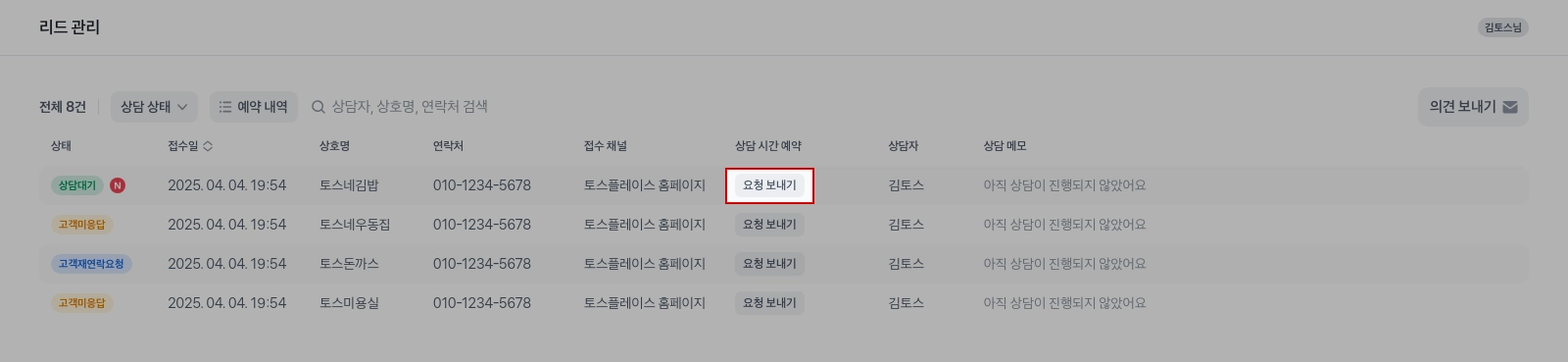 상담 시간 예약 → 요청 보내기 버튼을 누르면 예약 알림톡을 보낼 수 있어요.