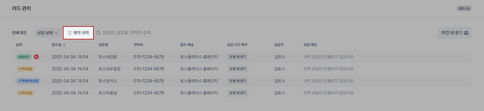 예약 내역 버튼을 누르면 상담 시간이 예약된 리드만 볼 수 있어요.