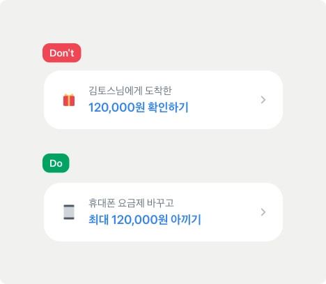 문구를 읽고, 1초 안에 유저가 나에게 유용한 정보인지 파악할 수 있어야 해요. 밸류가 한번에 보이도록 최대한 풀어서 써주세요.