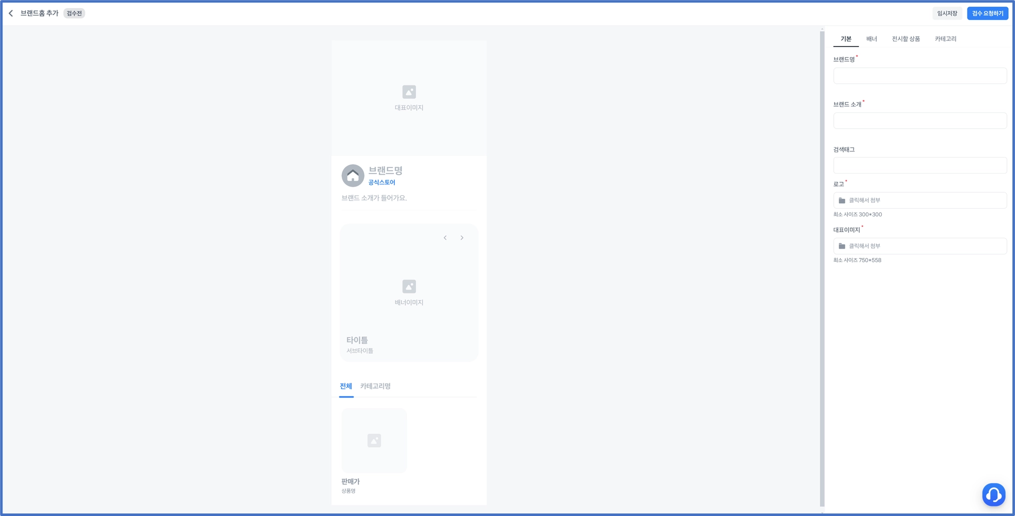 필수 값을 모두 채운 후에 우측 상단의 [검수 요청하기] 를 통해 브랜드홈 검수를 신청해주세요.