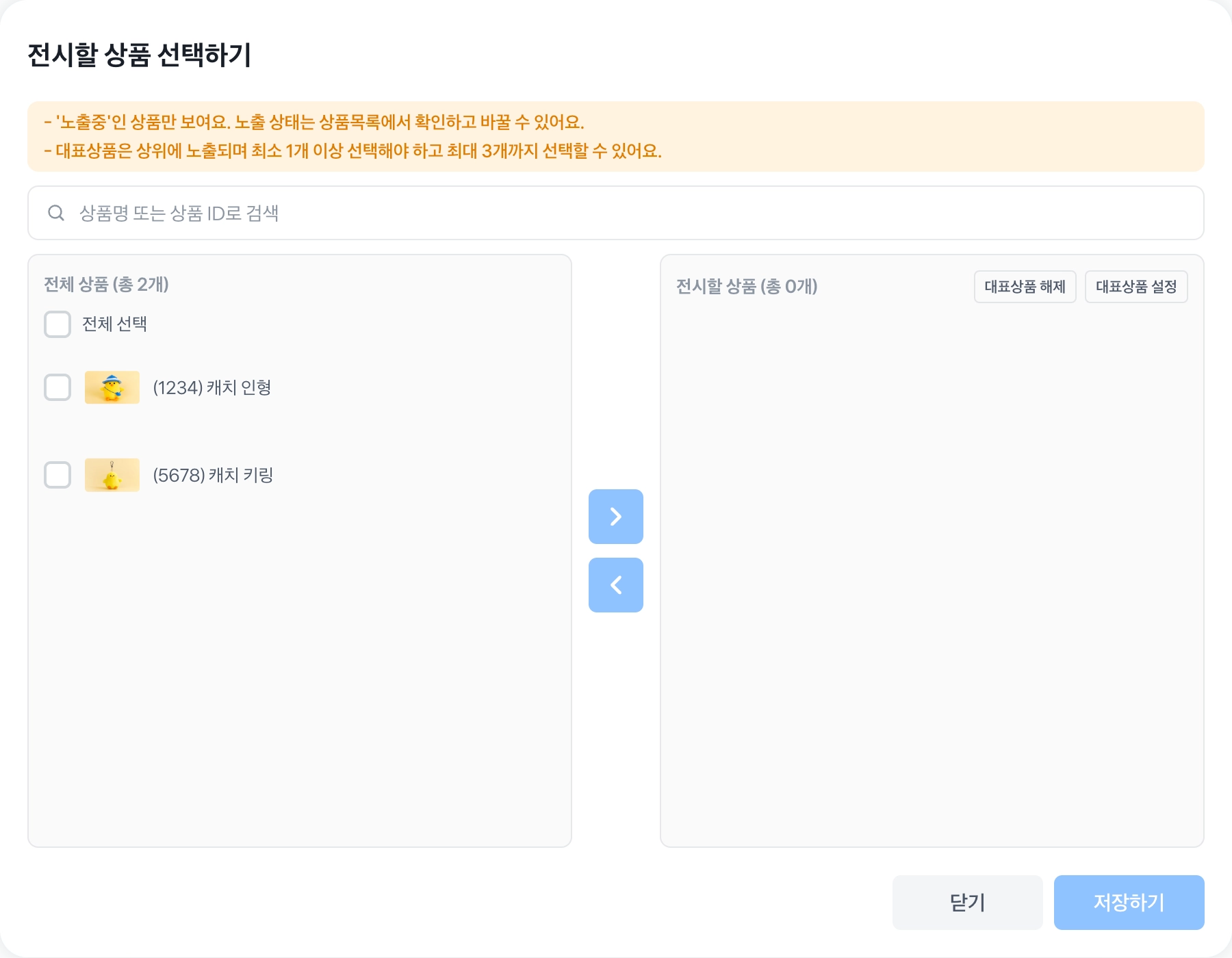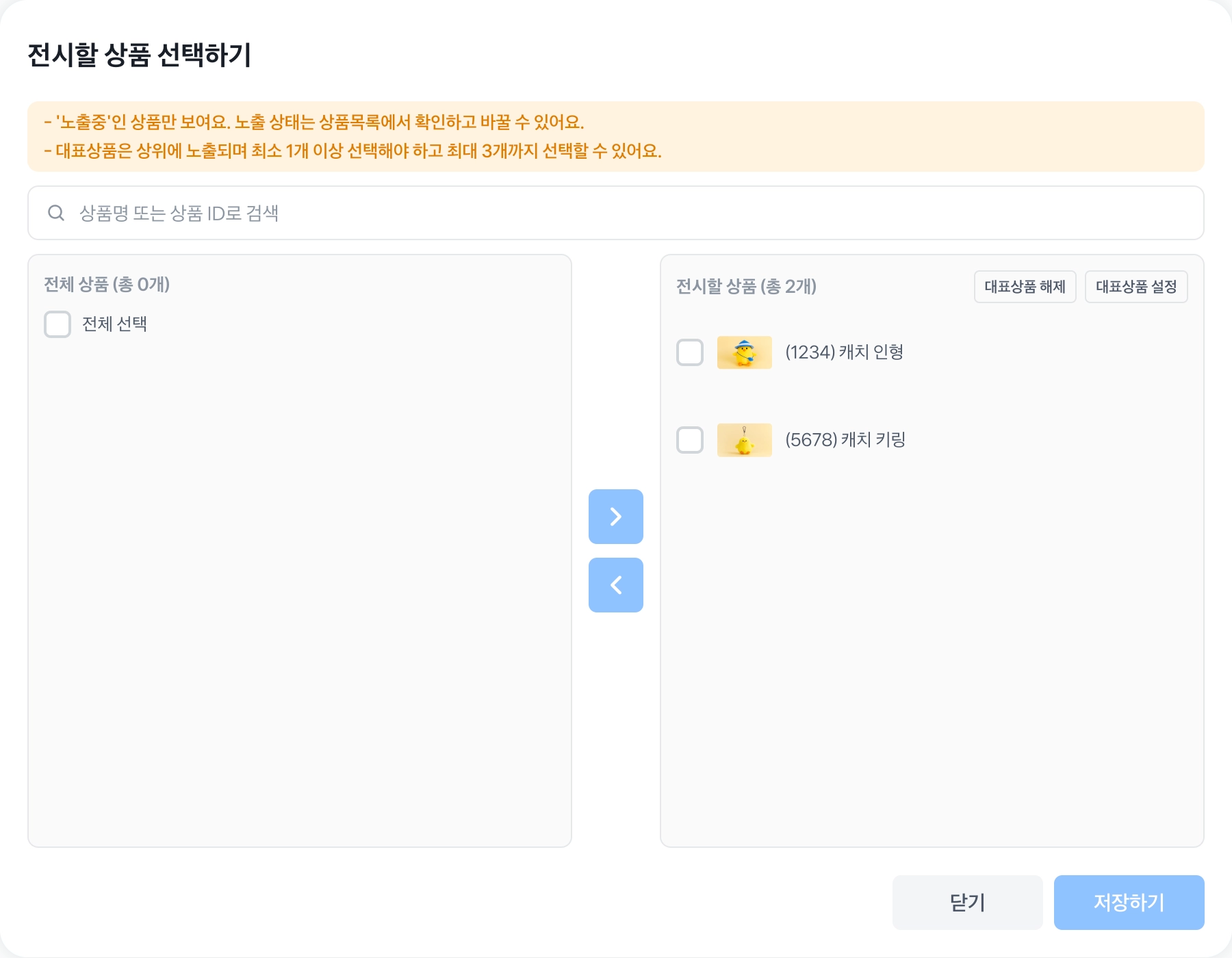 각 카테고리에 포함될 상품은 전체 전시 상품 내에서만 선택할 수 있어요.
