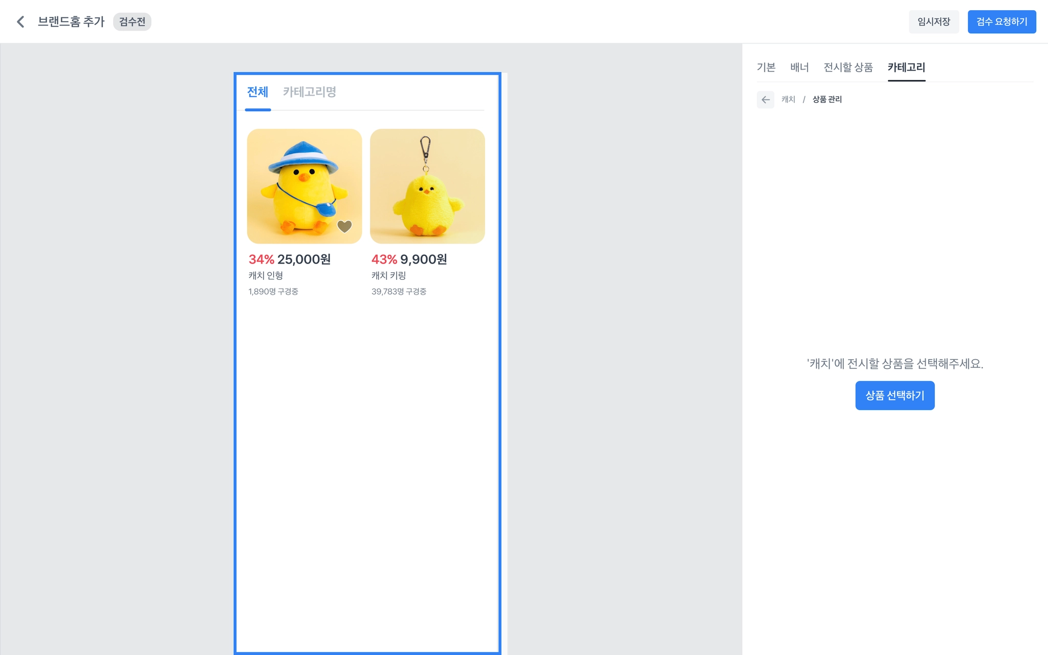 전시할 상품 탭에서 기본탭과 배너탭 아래에 전시될 상품을 선택해주세요.