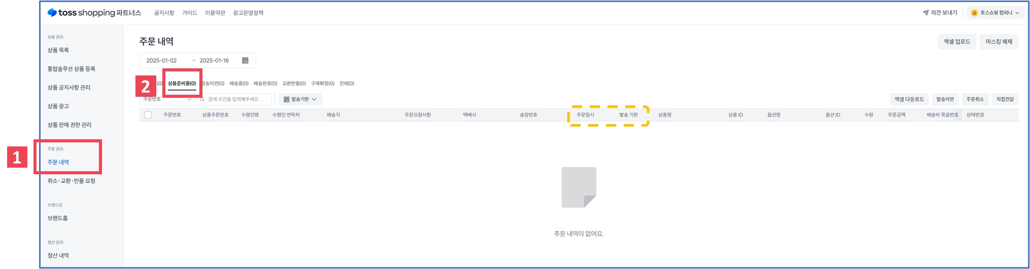 경로 : 토스쇼핑 파트너스 → 주문관리 → 주문내역 → [상품준비중]