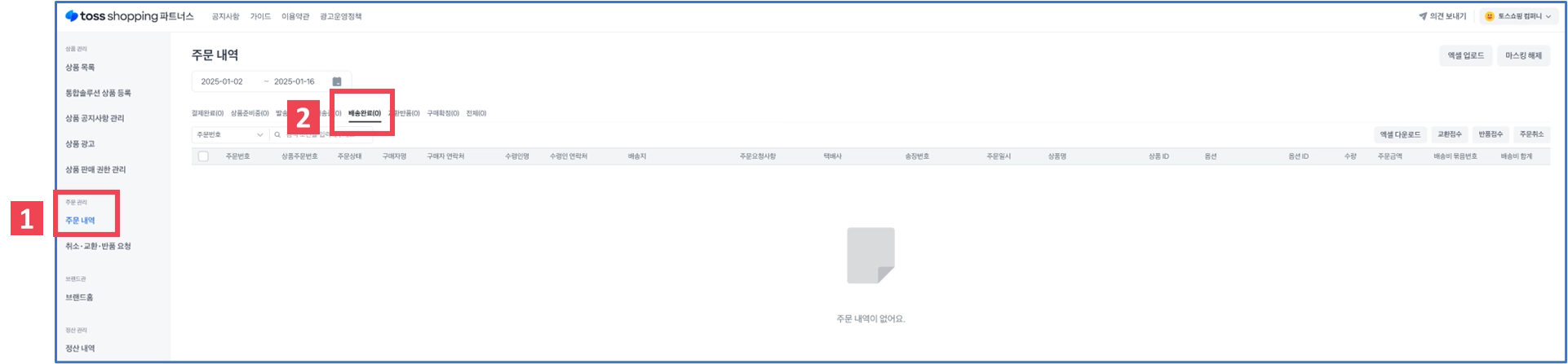 경로 : 토스쇼핑 파트너스 → 주문관리 → 주문내역 → [배송완료]