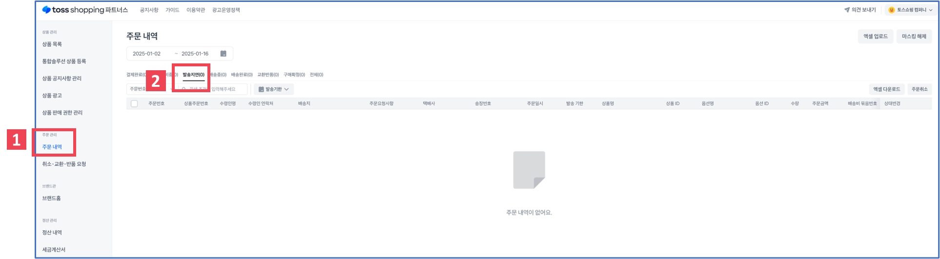 경로 : 토스쇼핑 파트너스 → 주문관리 → 주문내역 → [발송지연]