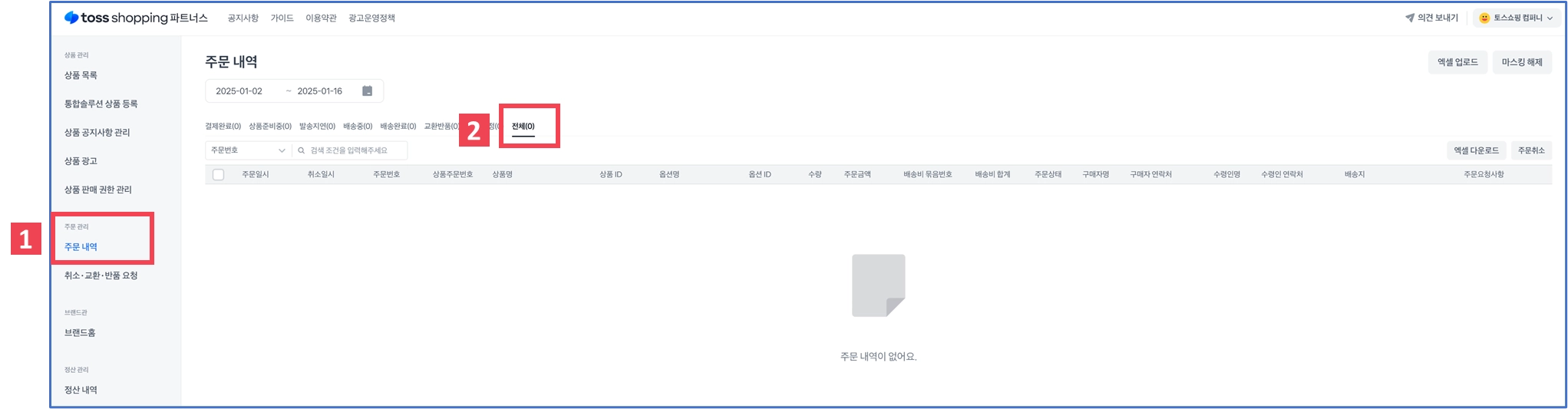 경로 : 토스쇼핑 파트너스 → 주문관리 → 주문내역 → [전체]