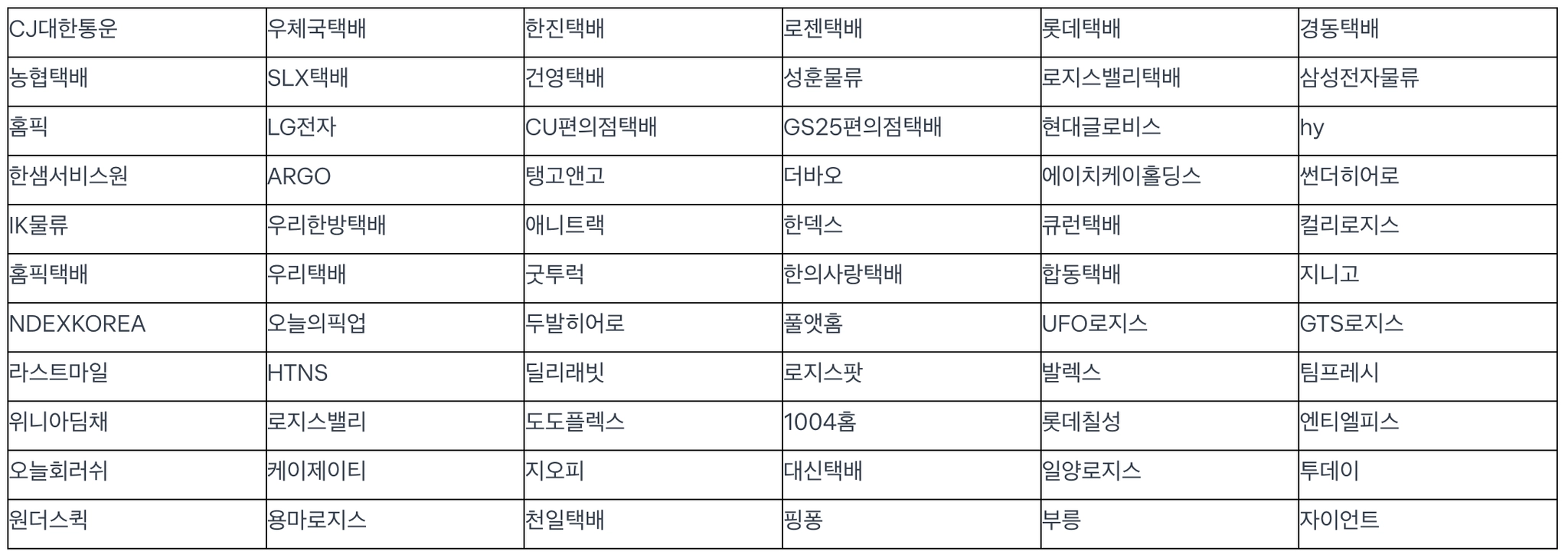 엑셀 사용시 필요한 택배사 코드는 아래 표를 참고해주세요. ** 참고 : 로지아이 택배는 롯데택배로 등록해 주세요.