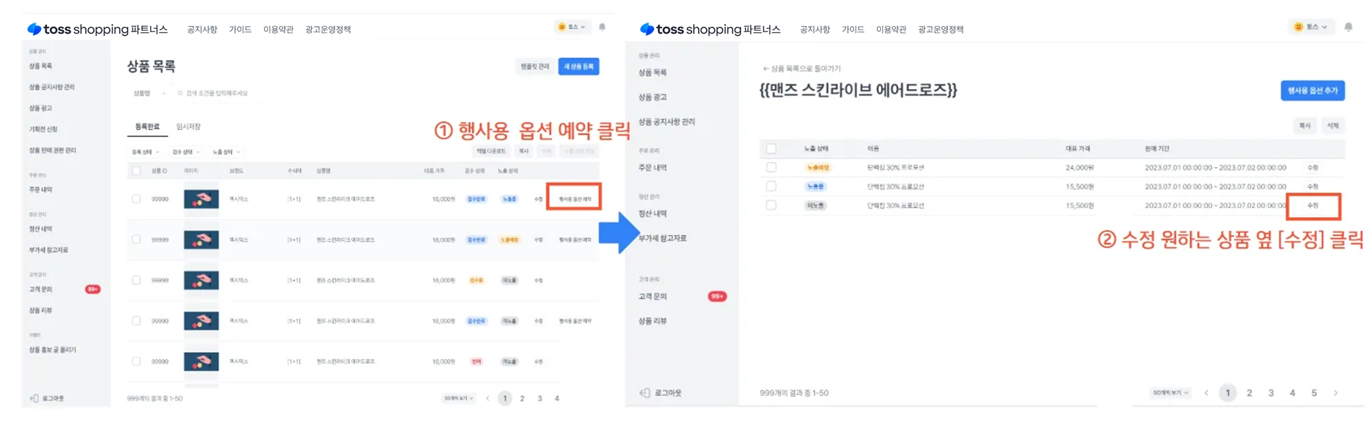 경로 : 토스쇼핑 파트너스 → 상품 목록 → 수정 원하는 상품 옆 [행사용 옵션 예약] → [수정]