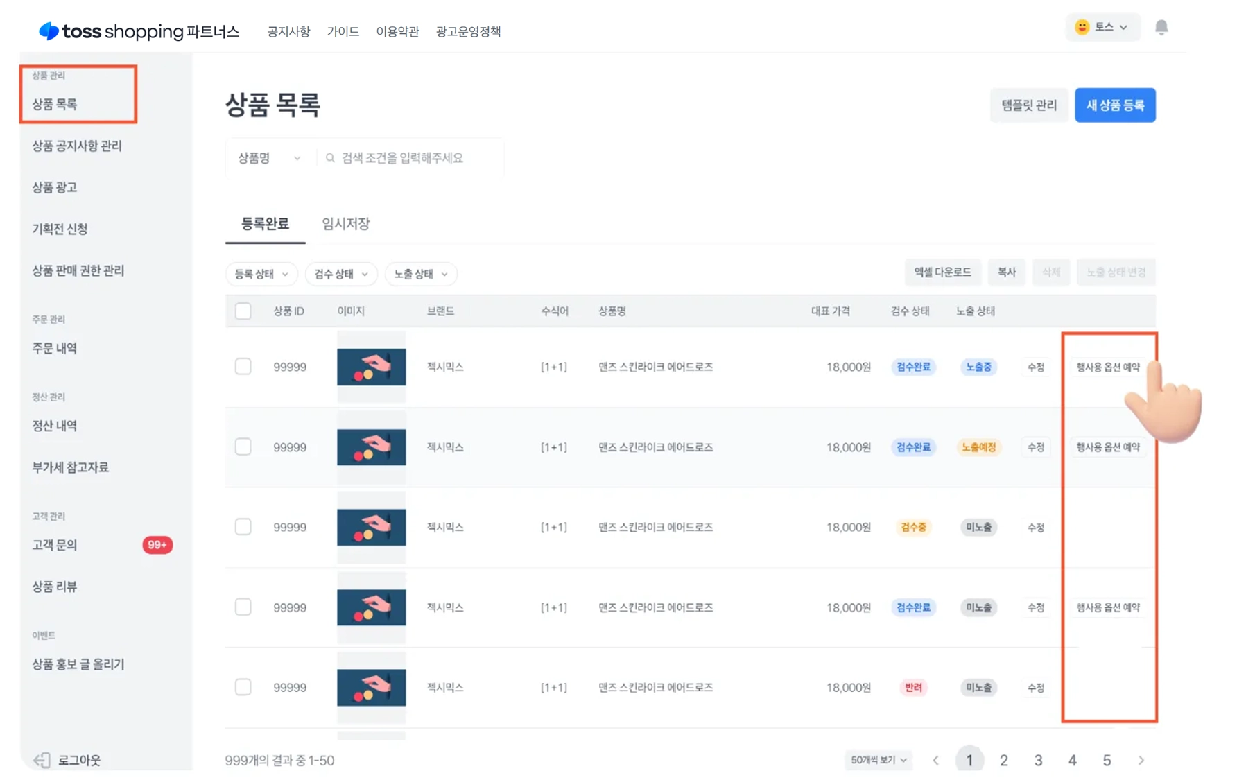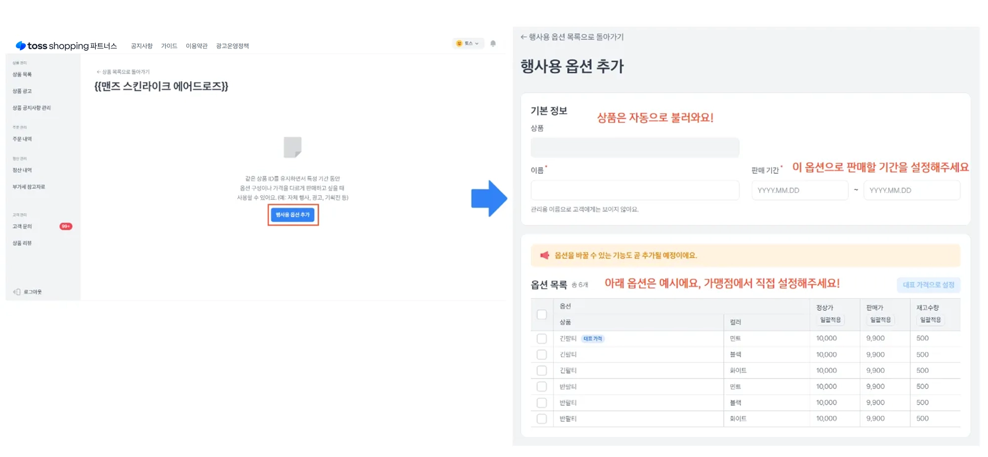 경로 : 토스쇼핑 파트너스 → 상품 목록 → 행사용 옵션 예약