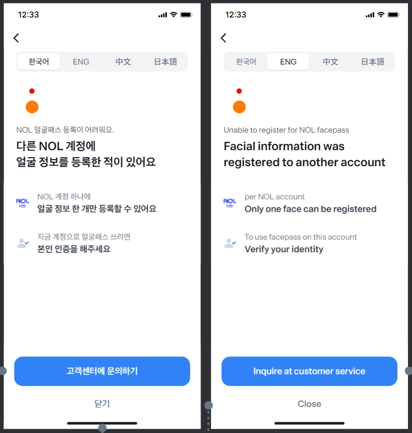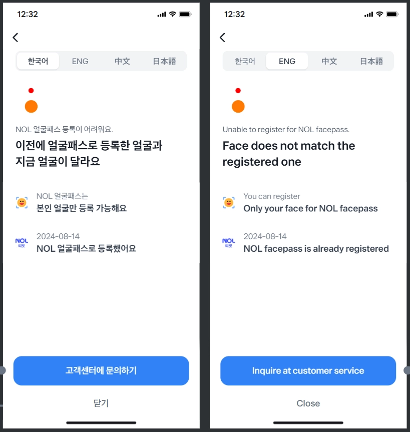 그래도 안 되면 NOL 티켓 앱 계정이 본인 계정인지 확인하고, 실제 예매한 티켓이 있는지, 얼굴패스 등록 완료 상태인지 확인해 주세요.