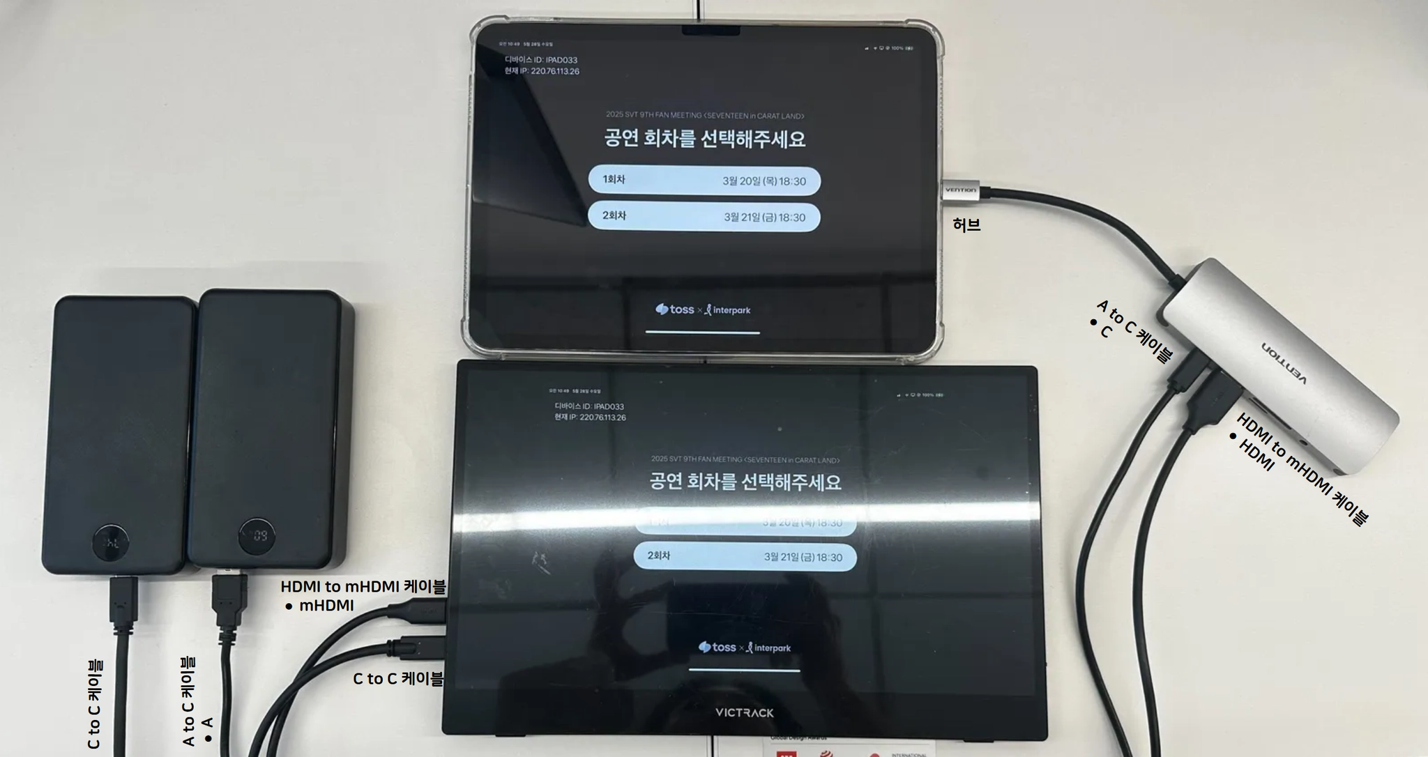 모니터는 전원 공급만 해주면 되고, 아이패드는 실제 충전이 되어야 하기에 A to C를 연결해 주세요.