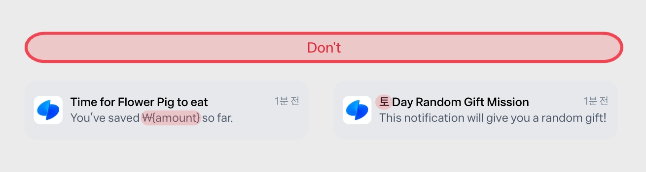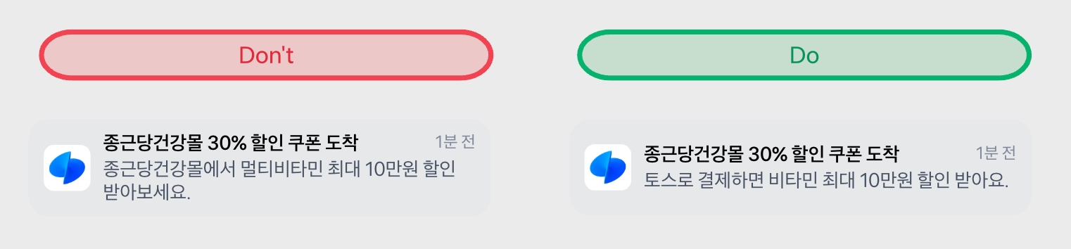 ‘토스’ 언급 없이 외부 브랜드 이름만 나오면, 사용자는 푸시 발신 주체가 누구인지, 토스가 왜 이런 푸시를 보내는지 혼란스러울 수 있어요.