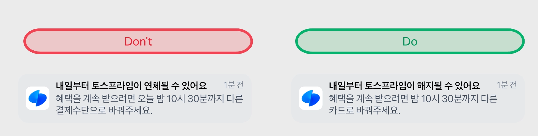 실제보다 더 급박하게 표현하면 사용자가 놀랄 수 있어요. ‘연체’, ‘미납’처럼 위기감을 주는 단어는 특히 더 주의해주세요.