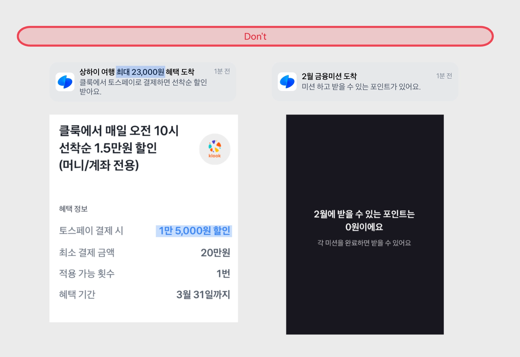 자극적인 문구나 사용자와 맞지 않는 푸시는 순간의 클릭은 유도할 수 있지만, 장기적으로는 서비스 신뢰를 해칠 수 있어요. 경계해야 할 표현을 더 직관적으로 보여주기 위해, 실제로 #problem-of-toss에 자주 올라온 문제 사례들을 중심으로 기준점을 정리해봤어요.