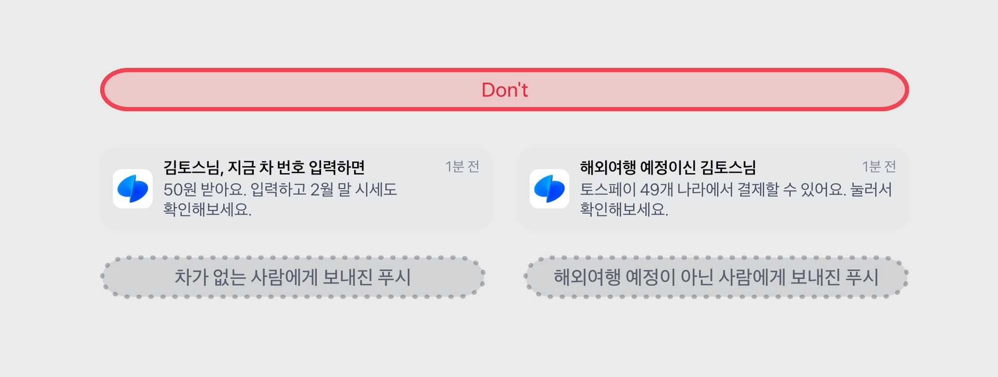 내 상황과 맞지 않은 푸시를 받으면, ‘왜 나한테 이런 메시지가 왔지?’ 하고 혼란스러워요. 실제로 #problem-of-toss에 가장 많이 제보되는 유형이기도 해요.