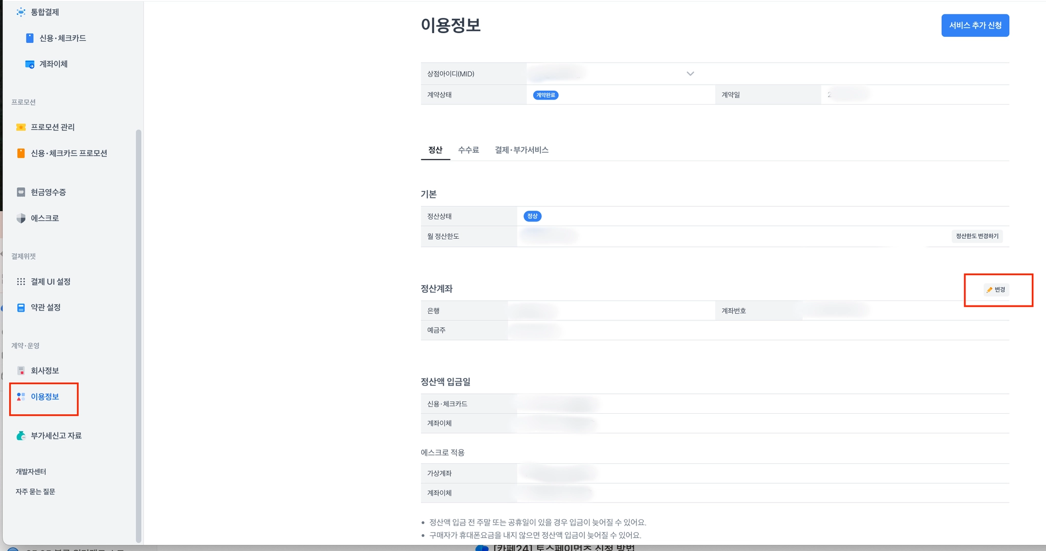 정산 탭 내 정산계좌 변경하기 버튼을 선택해 주세요.