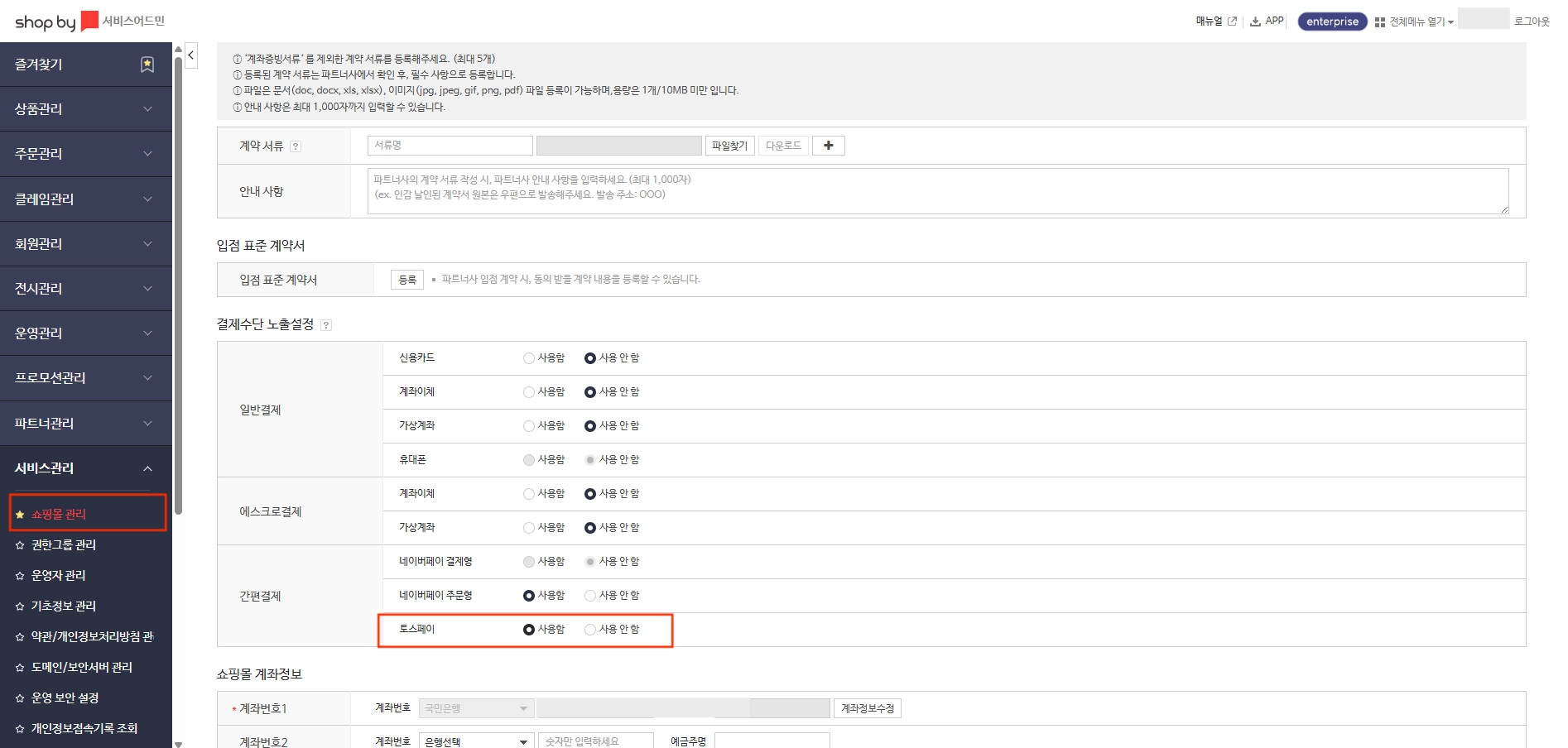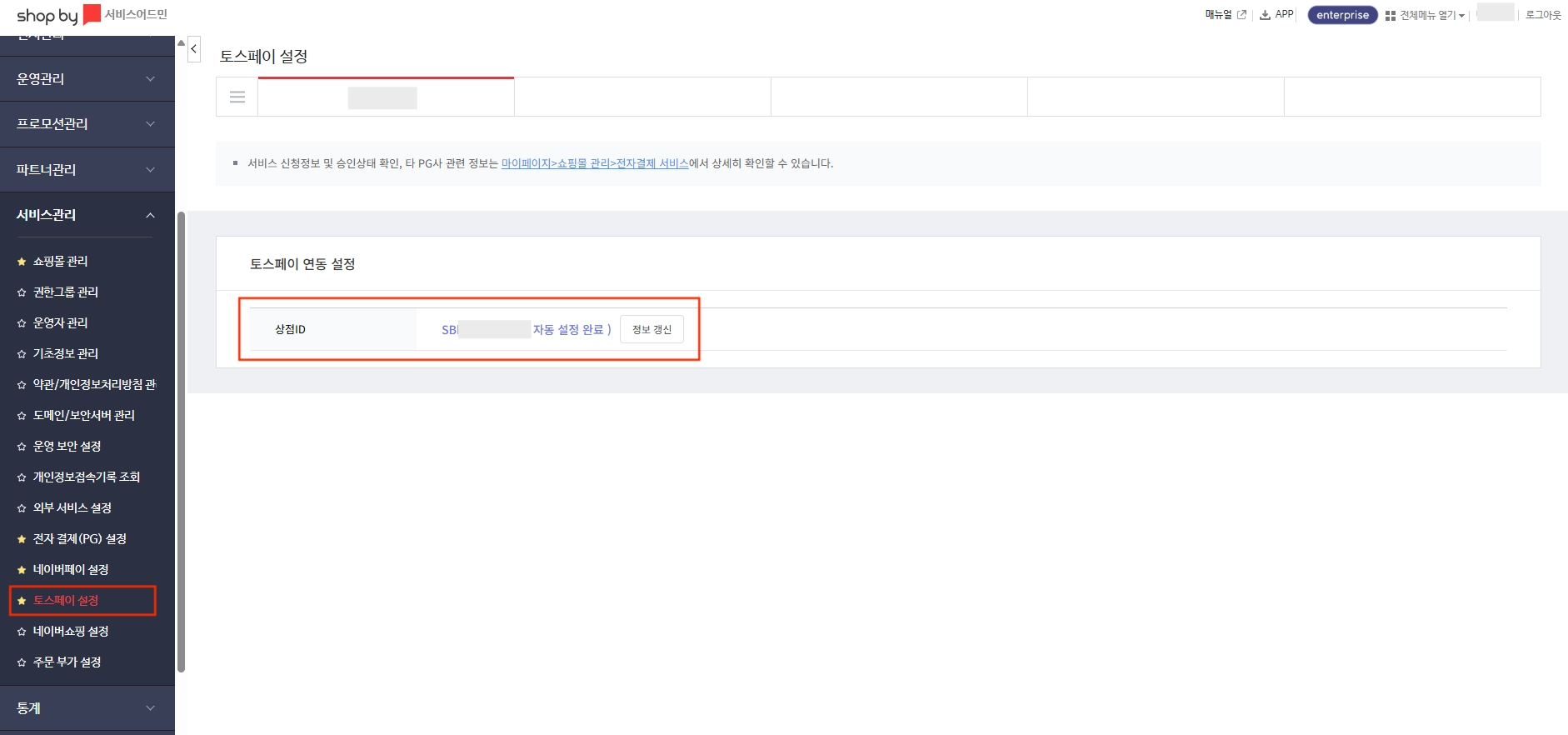 샵바이 서비스 어드민 > 서비스 관리 > 토스페이 설정 메뉴로 접속해주세요