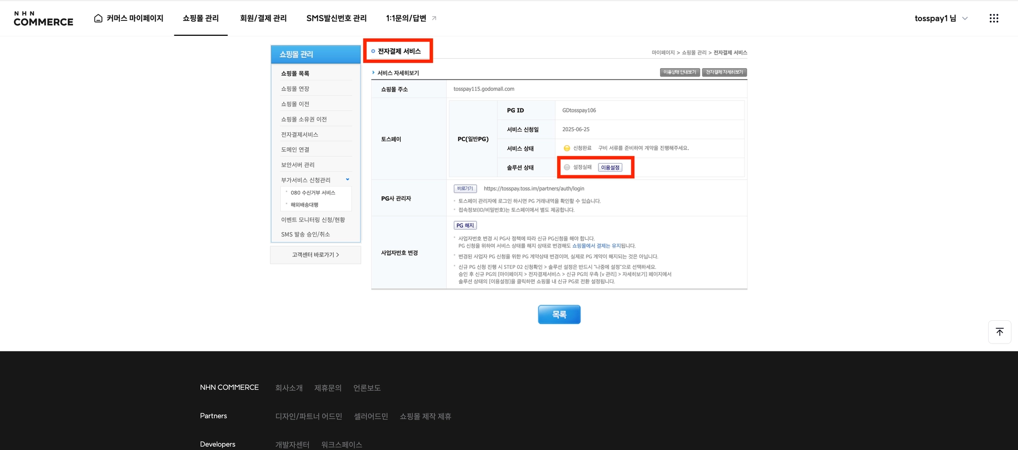 신청한 토스페이 MID 확인할 수 있는 페이지 입니다. (또는 NHN커머스 > 마이페이지)