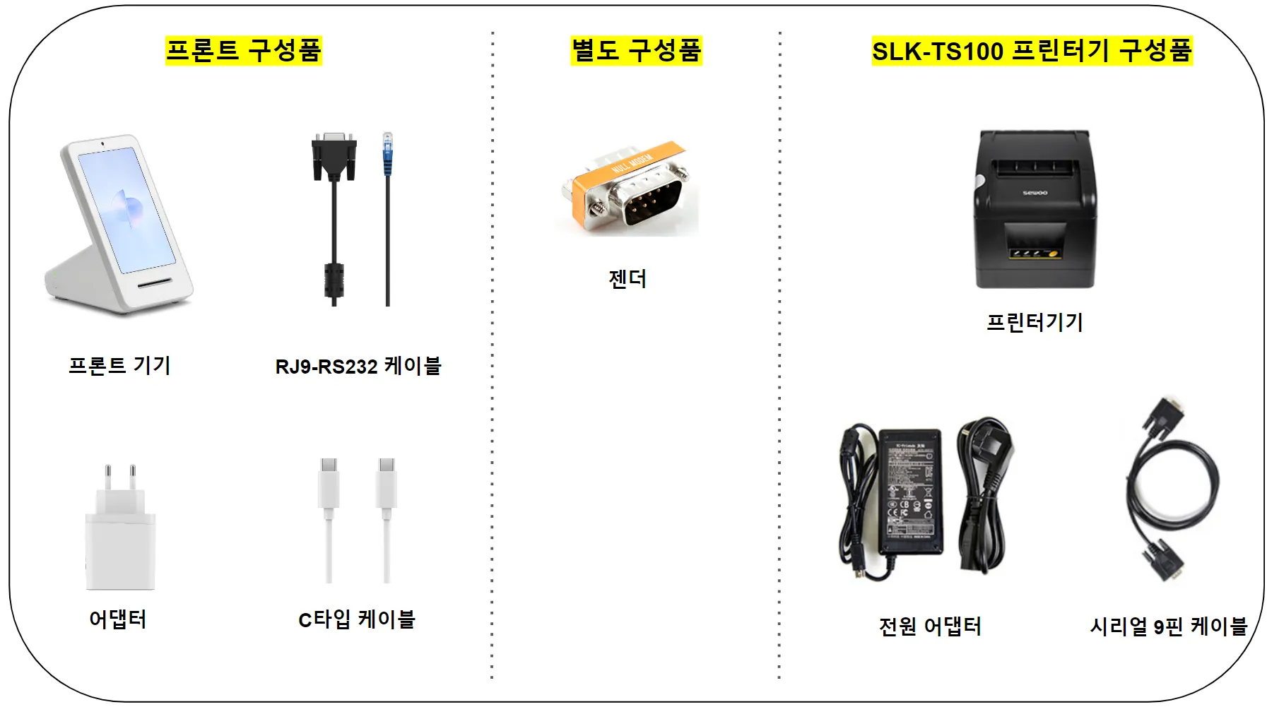 이 방식은 포스와 프론트는 무선으로 연결하고, 프론트에 있는 RJ9에 단말기 케이블을 이용해서 시리얼 연결하는 방식으로 별도 젠더가 필요합니다.
