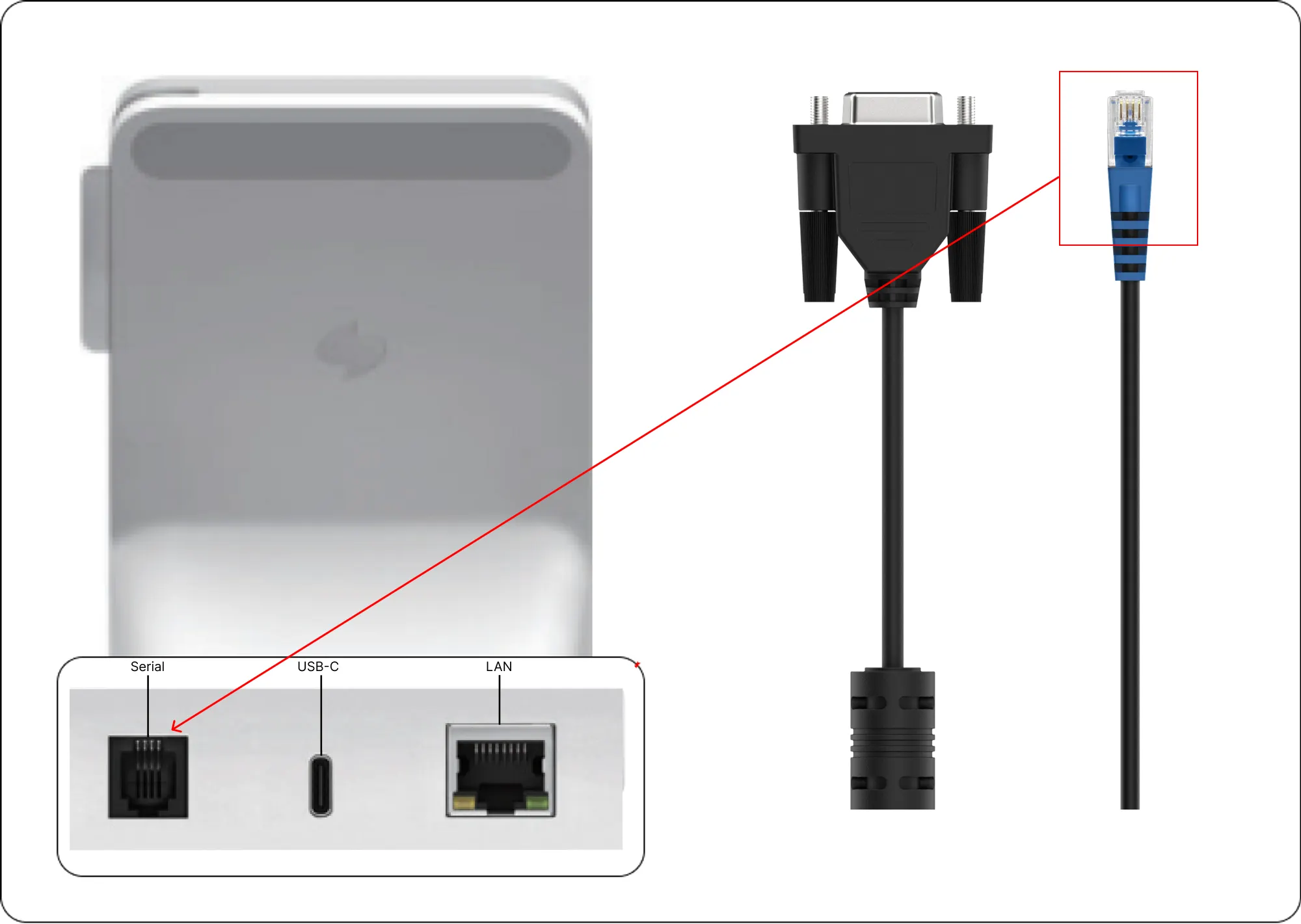 프론트 단말기 Serial 포트에 RJ9-RS232 케이블을 연결 해주세요.