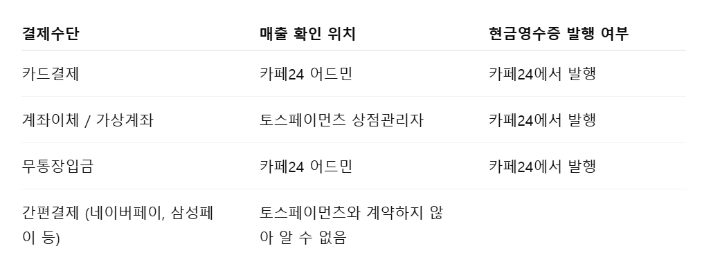 토스페이먼츠를 거치지 않고, 사업자 계좌로 바로 입금해 드리는 카페24의 자체적인 서비스이기 때문이에요.