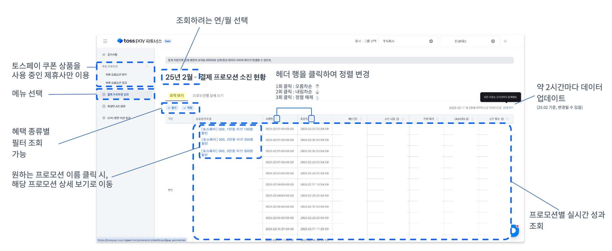 로그인 후 좌측 메뉴에서 결제 프로모션 > 결제 프로모션 성과 메뉴를 선택하시면 조회가 가능합니다.
